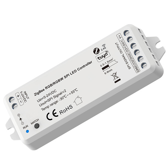SD sērijas SPI/RGBIC (t.sk. COB/NEON) LED lentu kontrolieris ar segmentētu vadību (līdz 20 segmentiem), 44 efektiem, mūzikas režīmu un grafikiem. Vadība ar TUYA Smart/Smart Life, ZigBee vārtejas atbalsts un RF 2.4GHz tālvadība. Barošana 5–24V, max 8A, līdz 1000 pikseļiem, IP20.