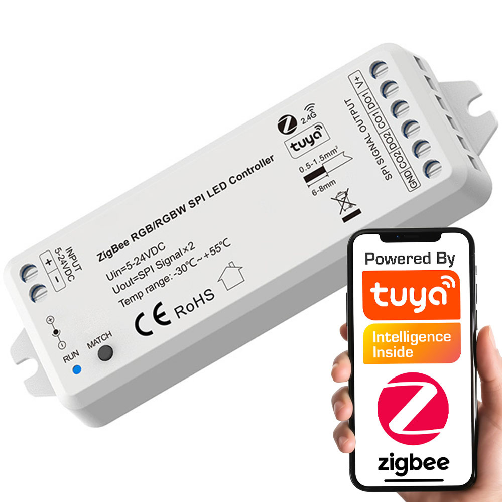 Viedais SD sērijas LED kontrolieris digitālajām SPI lentēm (MONO, RGBIC, RGBWIC), ieskaitot COB un NEON risinājumus. Nodrošina segmentētu vadību un animācijas, ļauj programmēt līdz 20 segmentiem TUYA lietotnē, piedāvā 44 gatavus efektus, ainas, aptumšošanu, grafikus un mūzikas režīmu (reakcija uz skaņu caur viedtālruņa mikrofonu). Kontrolieris darbojas ar TUYA Smart/Smart Life, atbalsta ZigBee savienojumu (nepieciešama ZigBee vārteja) un RF 2.4GHz vadību ar saderīgu SD sērijas tālvadības pulti (PLD067). Iespējama sinhronizācija ar citiem SD sērijas kontrolieriem.
