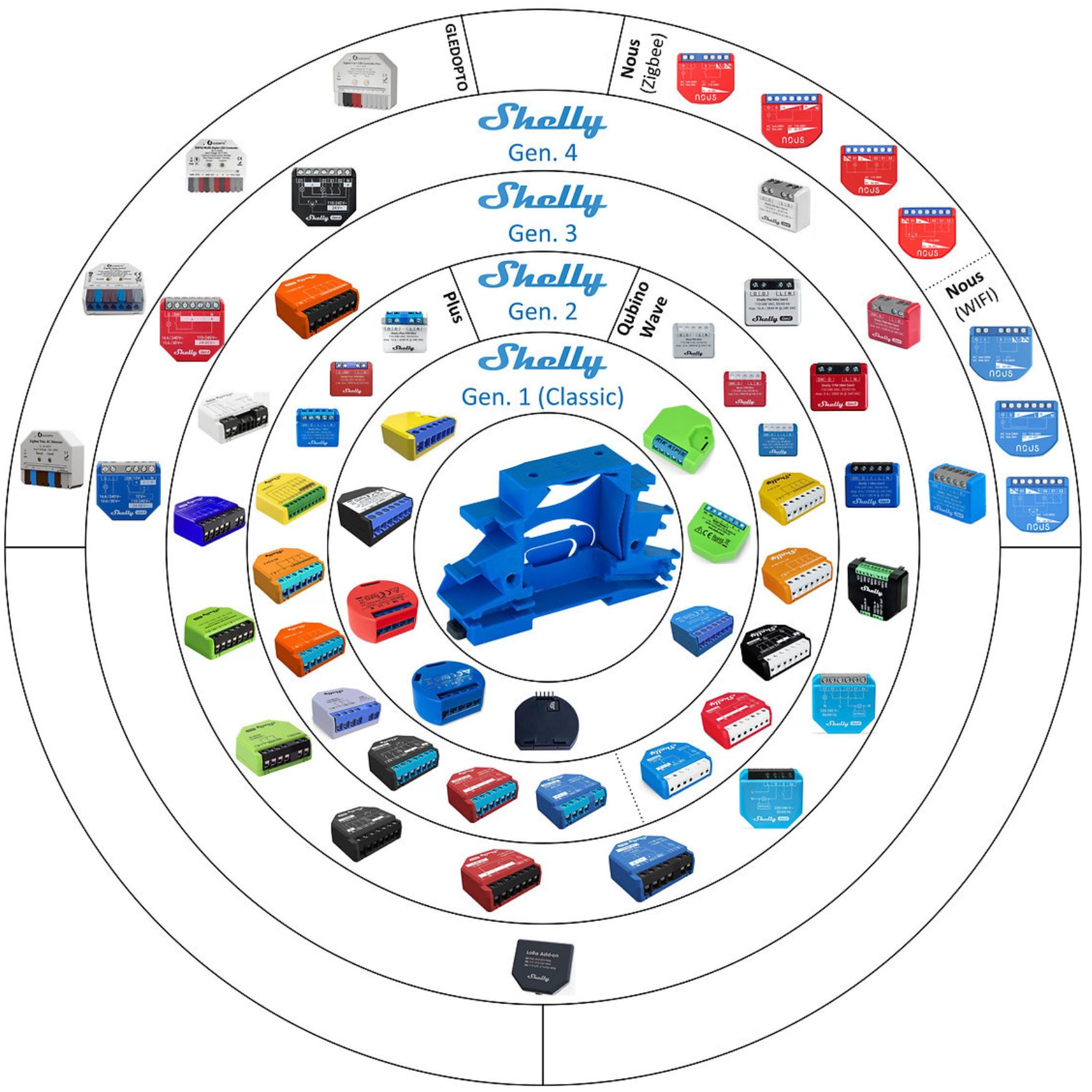 • Universāla saderība: Saderīgs ar visiem Shelly modernizētajiem moduļiem, tostarp 1. paaudzes (Shelly 1, 2.5, RGBW2, Dimmer) un jaunākiem (2. paaudzes – Plus, 3. paaudzes, Wave, 4. paaudzes un Mini) modeļiem. Saderīgs arī ar GLEDOPTO relejiem, piemēram, GL-C-309WL, GL-C-310WL, un Nous Wi-Fi un Zigbee modernizētajiem relejiem, piemēram, B1T, B2T, B3T, B1Z, B2Z, B3Z, B4Z.
