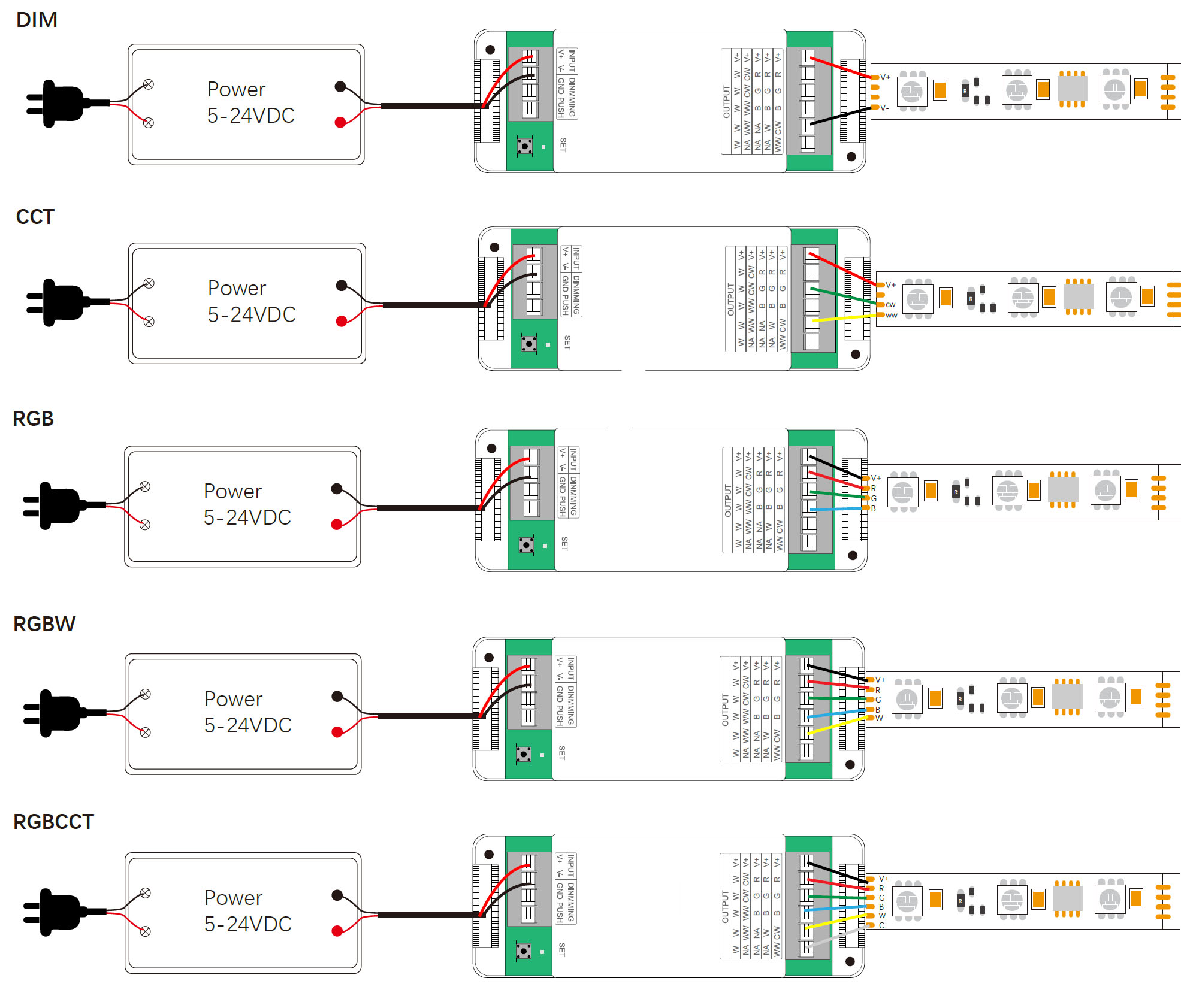 Tuya universālais 5-in-1 WiFi LED kontrolieris (PX sērija) paredzēts dažādu tipu LED lentēm: vienkrāsainām (DIM), CCT (maināma baltā temperatūra), RGB, RGBW un RGBCCT. Režīms pārslēdzams ar SET pogu uz korpusa.