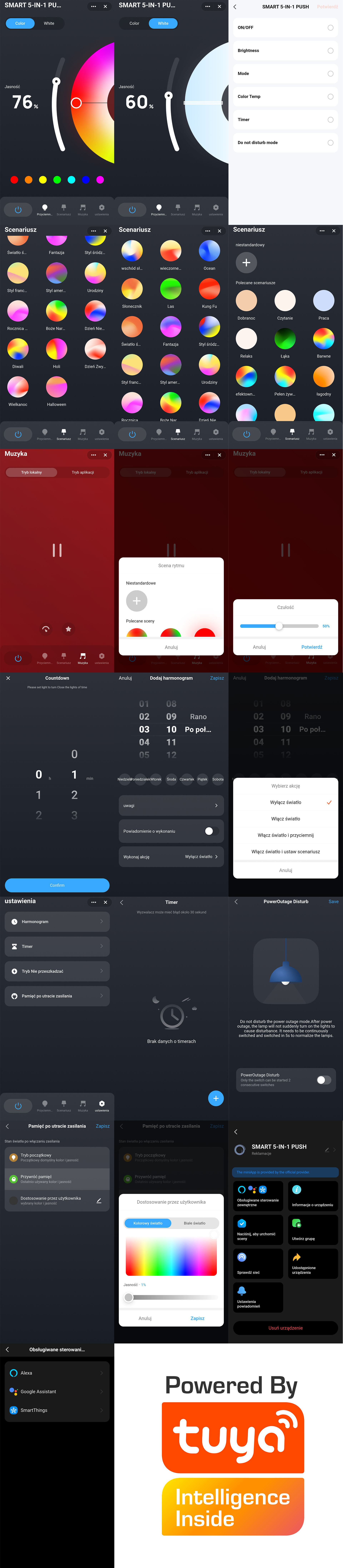 Vadība caur Tuya ekosistēmu (Android/iOS) nodrošina grafikus, ainas, automatizācijas, balss vadību un sinhronizāciju ar mūziku. Iebūvēts mikrofons skaņas efektiem. Atbalsta RF/MESH releja funkciju (signāla pārraide līdz ~30 m atklātā telpā), līdz 10 PX sērijas tālvadības pultīm un stāvokļa atmiņu pēc strāvas pazušanas.