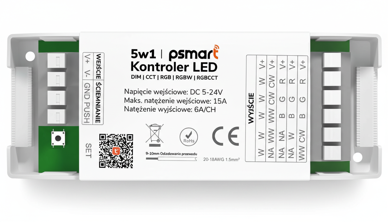 Universāls 5-in-1 WiFi LED lentes kontrolieris (DIM/CCT/RGB/RGBW/RGBCCT) ar Tuya Smart/Smart Life atbalstu. DC 5–24V, līdz 6A/kanāls (kopā 15A), PWM aptumšošana, mūzikas režīms (mikrofons), RF/MESH un PX tālvadības pults atbalsts, ieeja ārējai spiedpogai.