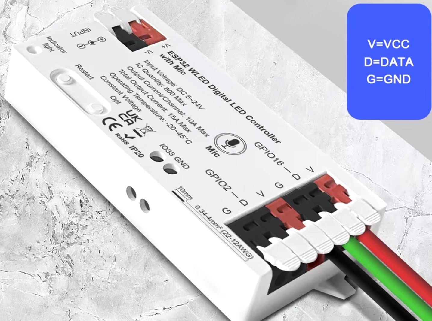 Adresējamo RGBIC LED lentu (WS2812B/SK6812/WS2811 u.c.) kontrolieris ar ESP32, Wi‑Fi un iebūvētu mikrofonu mūzikas režīmiem. Atbalsta WLED lietotni, pārlūkprogrammas vadību, segmentus un efektus. Barošana 5–24V DC, līdz 10A/kanālā un 15A kopā.
