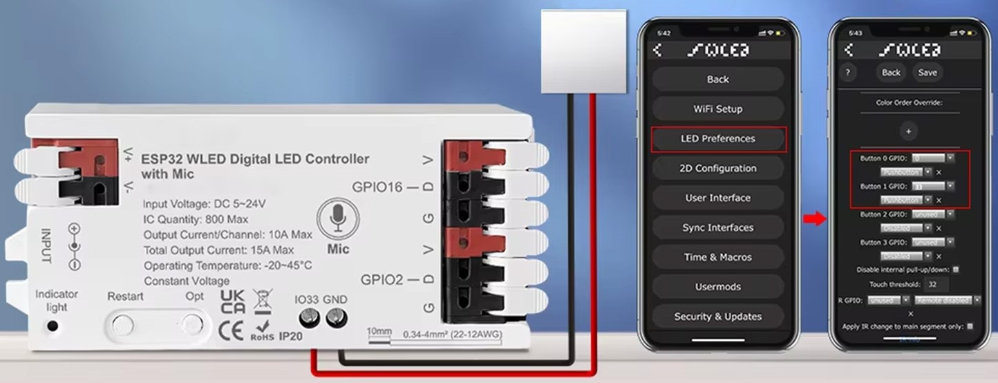 Vadība iespējama ar WLED lietotni un tīmekļa pārlūku, kā arī ar fiziskām pogām; iespējama ārējas pogas pieslēgšana (IO33). Iebūvētais mikrofons ļauj apgaismojumam reaģēt uz mūziku.