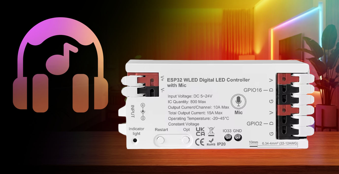 RGBIC WLED LED kontrolieris uz ESP32 bāzes ar iebūvētu mikrofonu, paredzēts adresējamām LED lentēm (piem., WS2812B, SK6812, WS2811 u.c.). Nodrošina pilnu katras diodes kontroli, segmentāciju, gradientus un vairāk nekā 100 efektus WLED ekosistēmā.