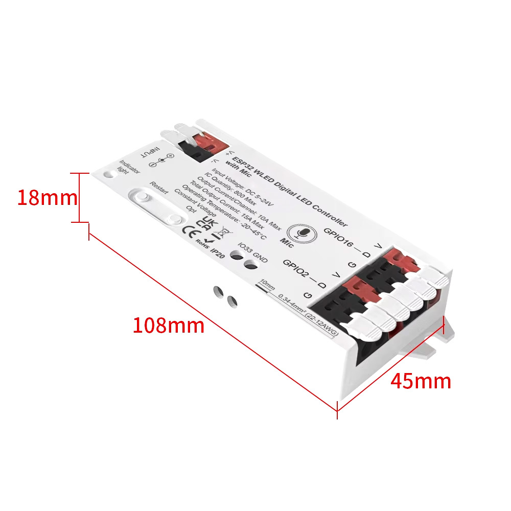 RGBIC WLED LED kontrolieris uz ESP32 bāzes ar iebūvētu mikrofonu, paredzēts adresējamām LED lentēm (piem., WS2812B, SK6812, WS2811 u.c.). Nodrošina pilnu katras diodes kontroli, segmentāciju, gradientus un vairāk nekā 100 efektus WLED ekosistēmā.