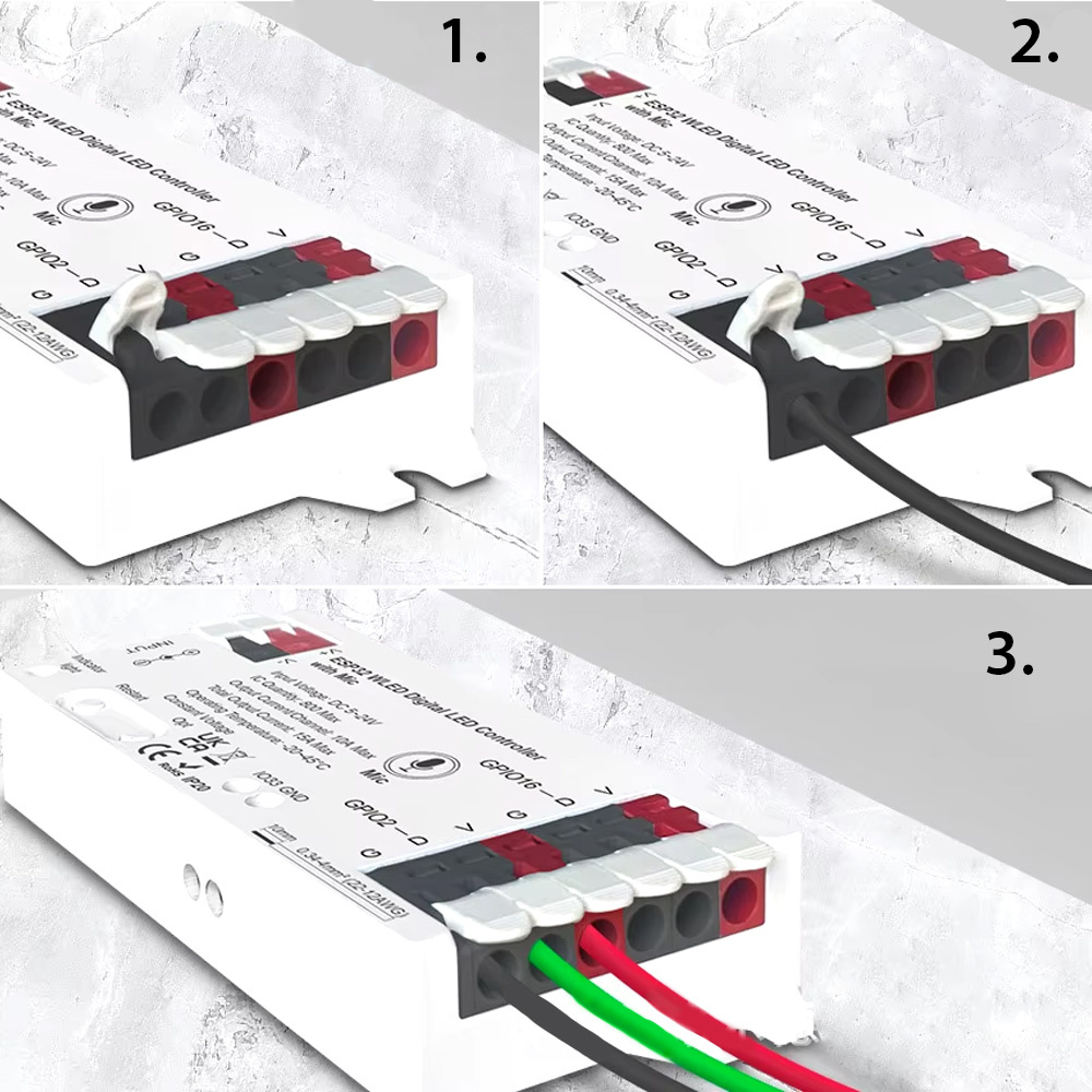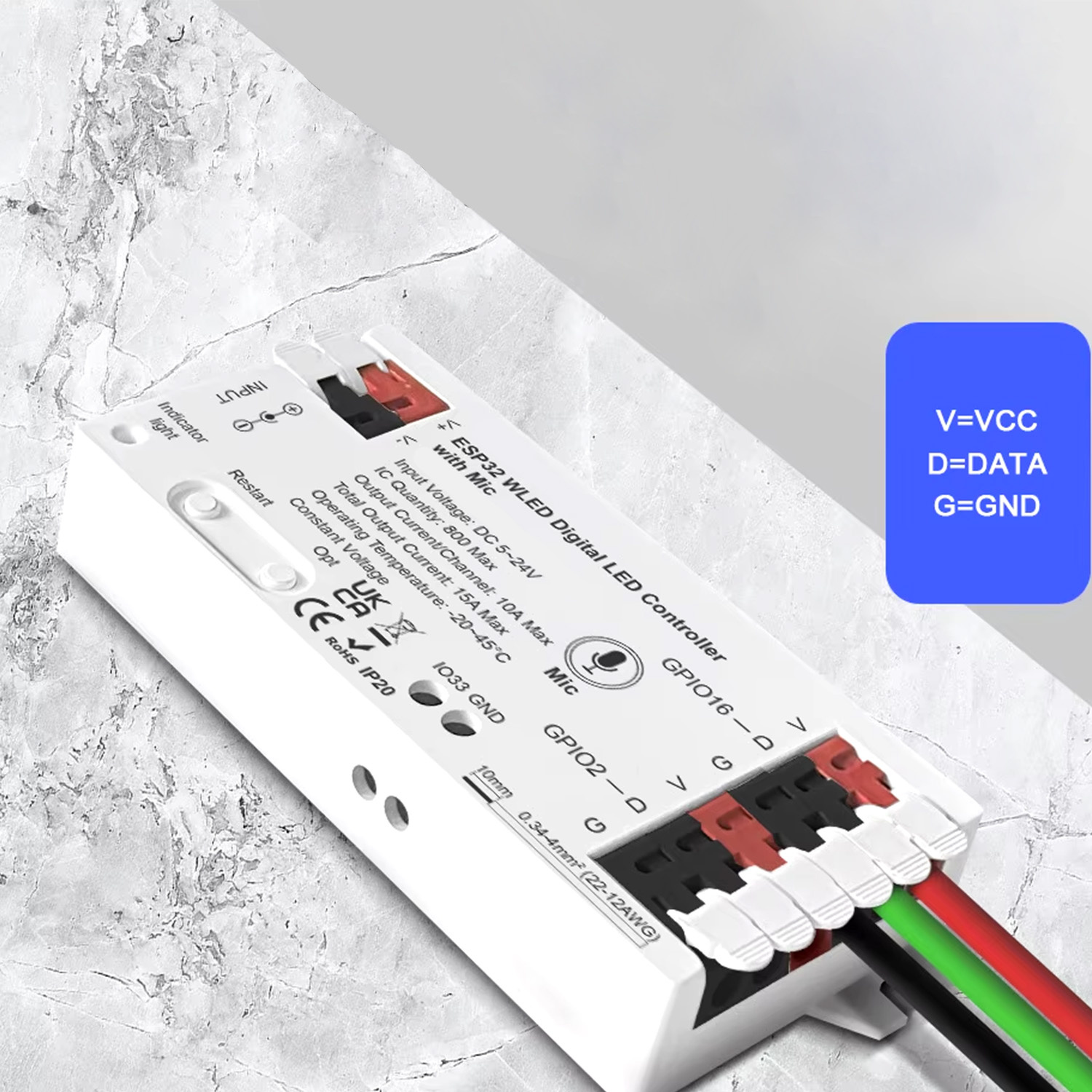 Adresējamo RGBIC LED lentu (WS2812B/SK6812/WS2811 u.c.) kontrolieris ar ESP32, Wi‑Fi un iebūvētu mikrofonu mūzikas režīmiem. Atbalsta WLED lietotni, pārlūkprogrammas vadību, segmentus un efektus. Barošana 5–24V DC, līdz 10A/kanālā un 15A kopā.
