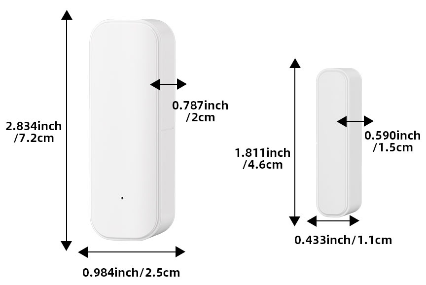 Specifikācija: ZigBee 3.0; noteikšanas attālums ≥15 mm; barošana 2×AAA (LR03); darbības laiks 4–6 mēneši; galvenais modulis 7.2×2.5×2 cm, magnēts 4.6×1.5×1.1 cm; ABS; darba temperatūra -10°C līdz 55°C; mitrums 0–95% RH; CE.