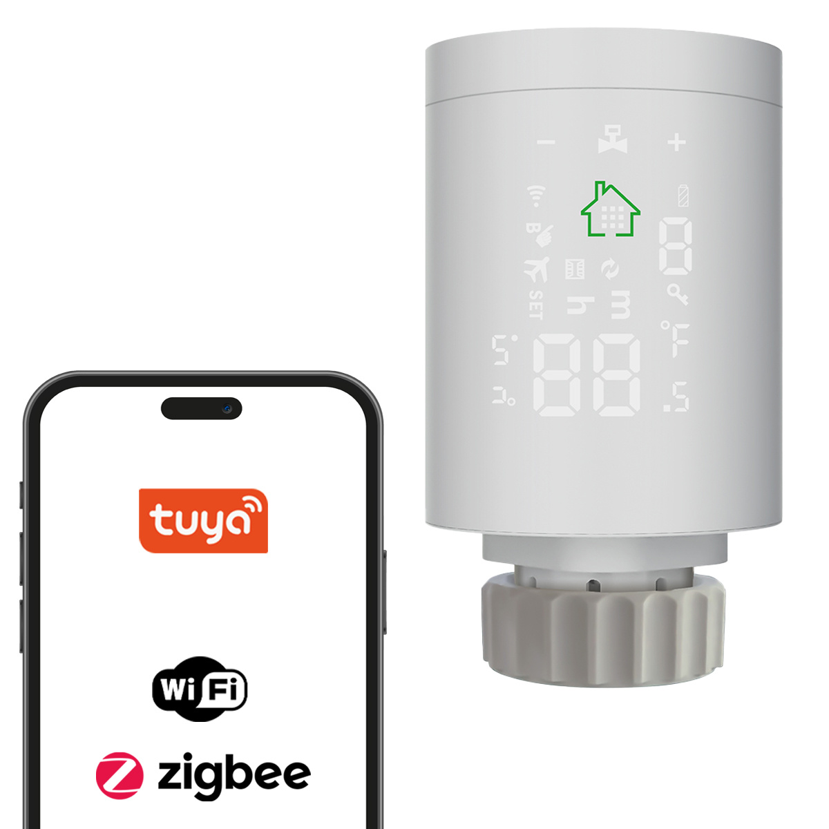 ZigBee 3.0 TUYA viedā termostatiskā galva radiatoram ar grafikiem, BOOST, atvērta loga un bērnu bloķēšanas funkcijām. Darbībai nepieciešams atsevišķs GTZ04S sensors un TUYA ZigBee vārteja.