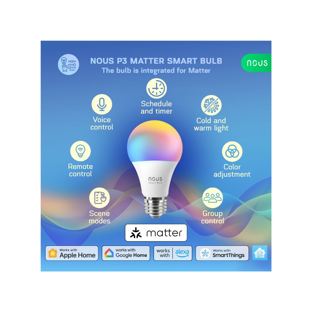 Nous P3 ir viedā Wi‑Fi RGB LED spuldze ar E27 ligzdu, kas paredzēta viedās mājas apgaismojuma automatizācijai un personalizācijai. Tā nodrošina 16 miljonus krāsu un regulējamu baltās gaismas temperatūru no 2700K līdz 6500K, ļaujot pielāgot apgaismojumu noskaņojumam un situācijai.