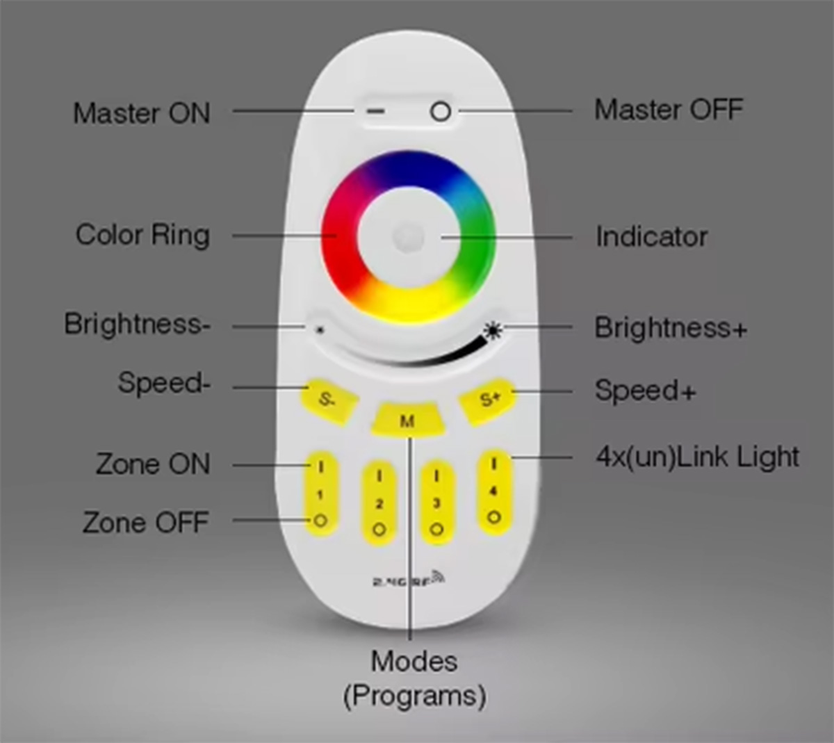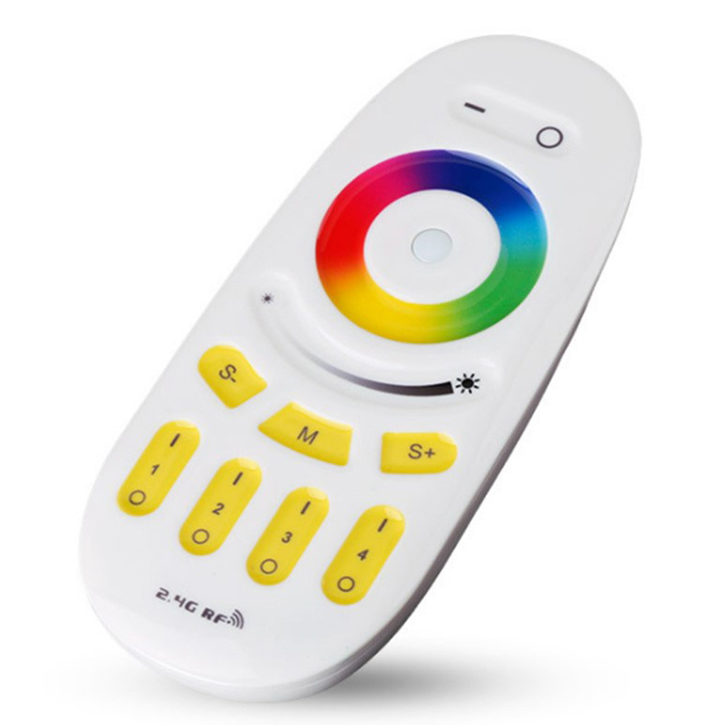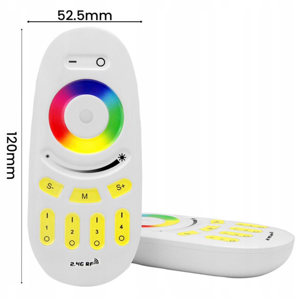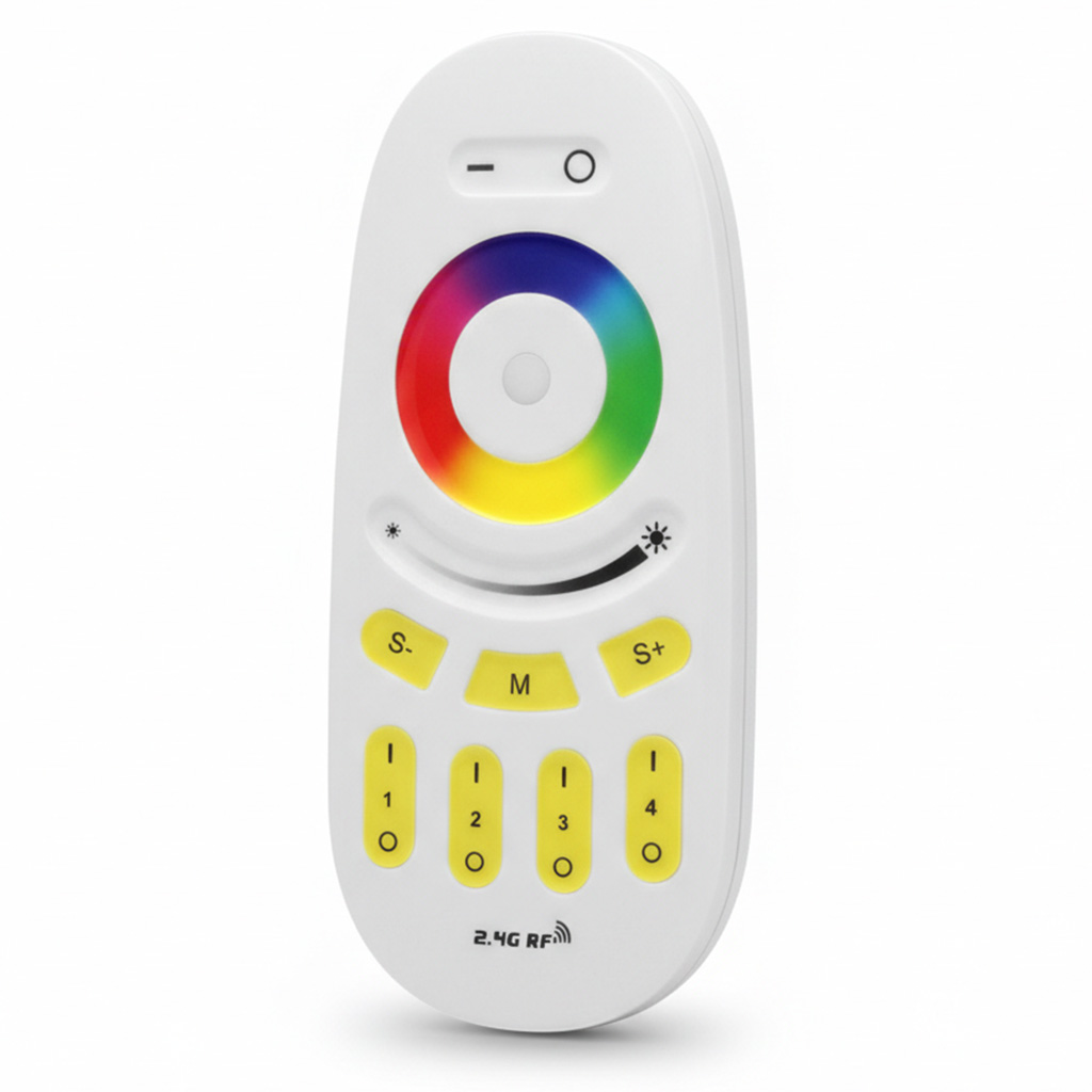 4 zonu RF (2.4GHz) tālvadības pults PSMART PX sērijas RGB LED lentu kontrolieriem ar skāriengredzenu krāsu izvēlei, spilgtuma slīdni un dinamiskajiem režīmiem.