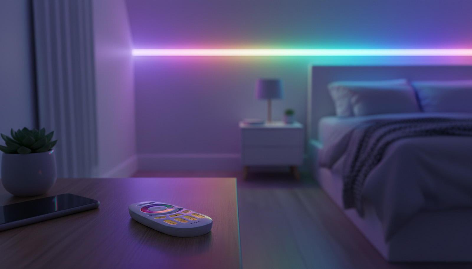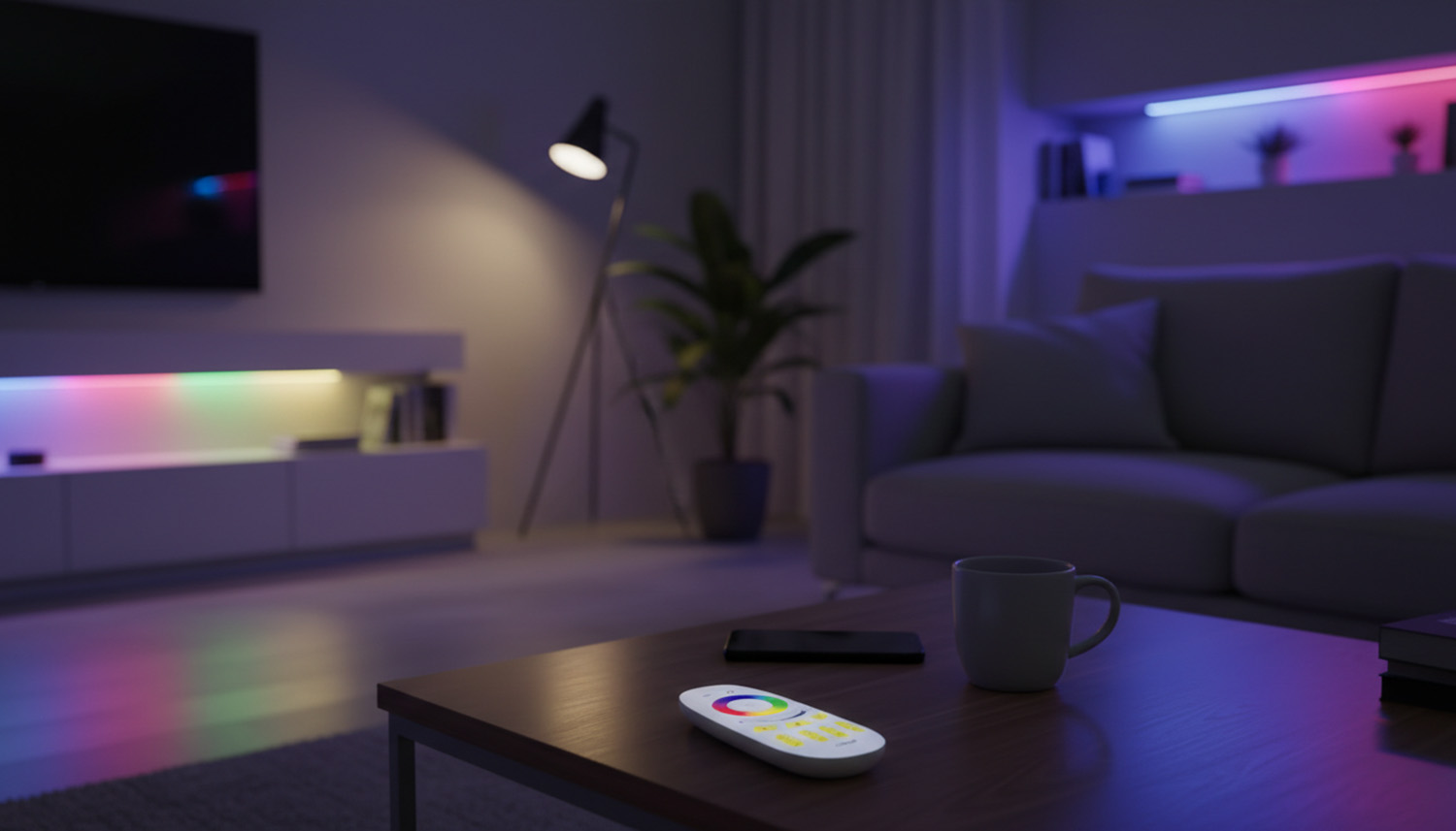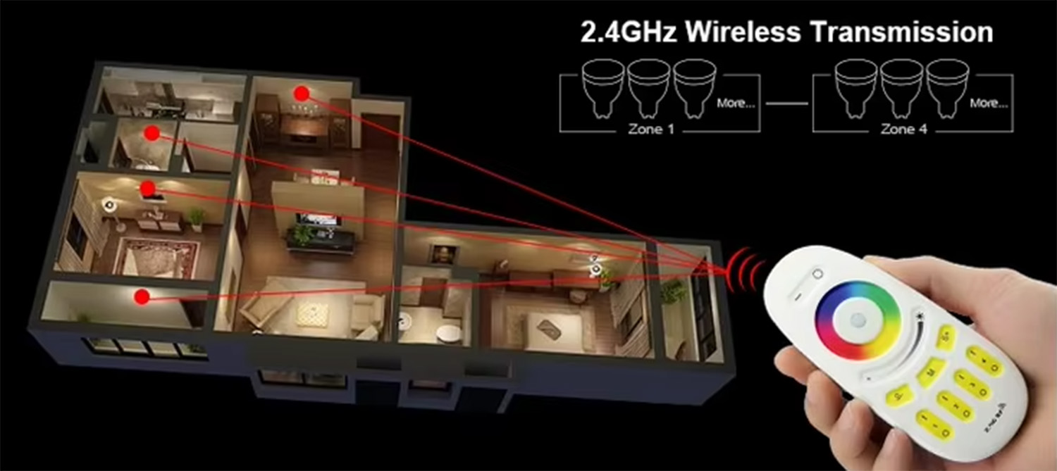 4 zonu RF (2.4GHz) tālvadības pults PSMART PX sērijas RGB LED lentu kontrolieriem ar skāriengredzenu krāsu izvēlei, spilgtuma slīdni un dinamiskajiem režīmiem.