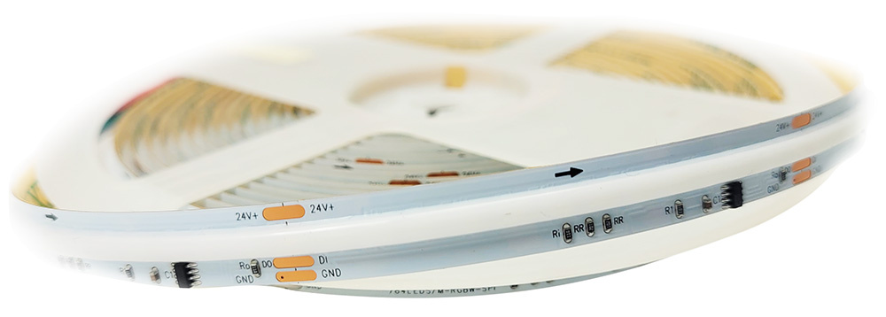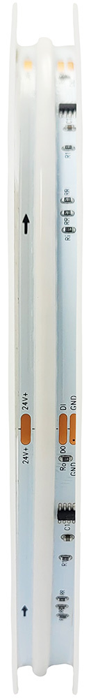 Digitālā COB LED lente 24V ar WS2814 RGBWIC (RGB + silti balta 3000K), 784 LED/m vienmērīgai gaismas līnijai, CRI ≥90, platums 10mm, IP20 (telpām), garums 5m, griežama ik pēc 7,1cm, JST-SM savienotājs.