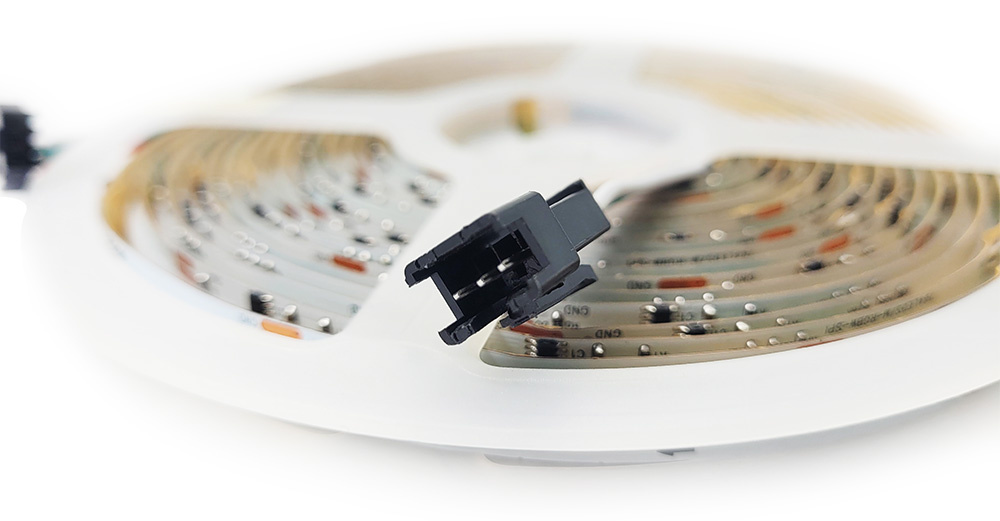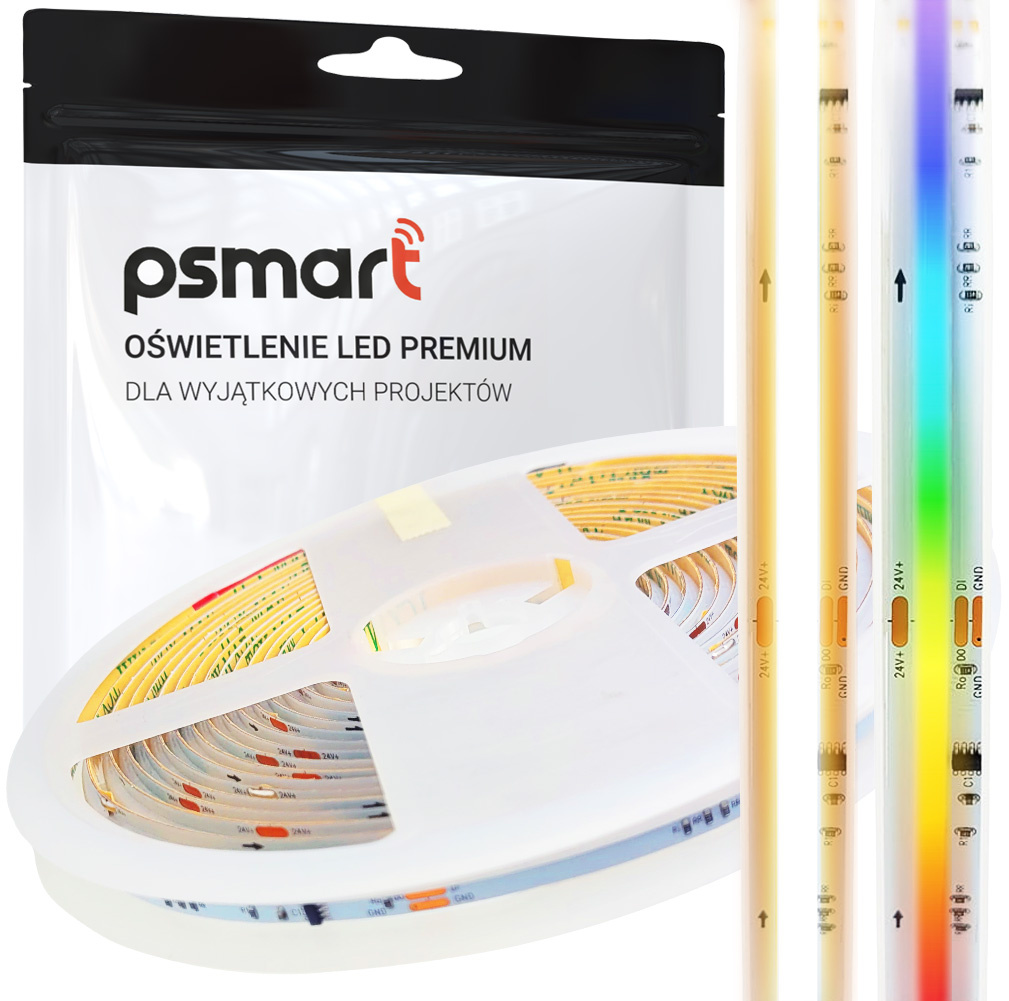 PSMART digitālā COB LED lente ar WS2814 RGBWIC nodrošina pilnu krāsu paleti un atsevišķi vadāmu silti balto 3000K apgaismojumu vienā lentē. COB tehnoloģija ar 784 LED/m veido īpaši vienmērīgu, nepārtrauktu gaismas līniju bez izteikta punktu efekta, savukārt CRI ≥90 nodrošina dabisku krāsu atveidi.