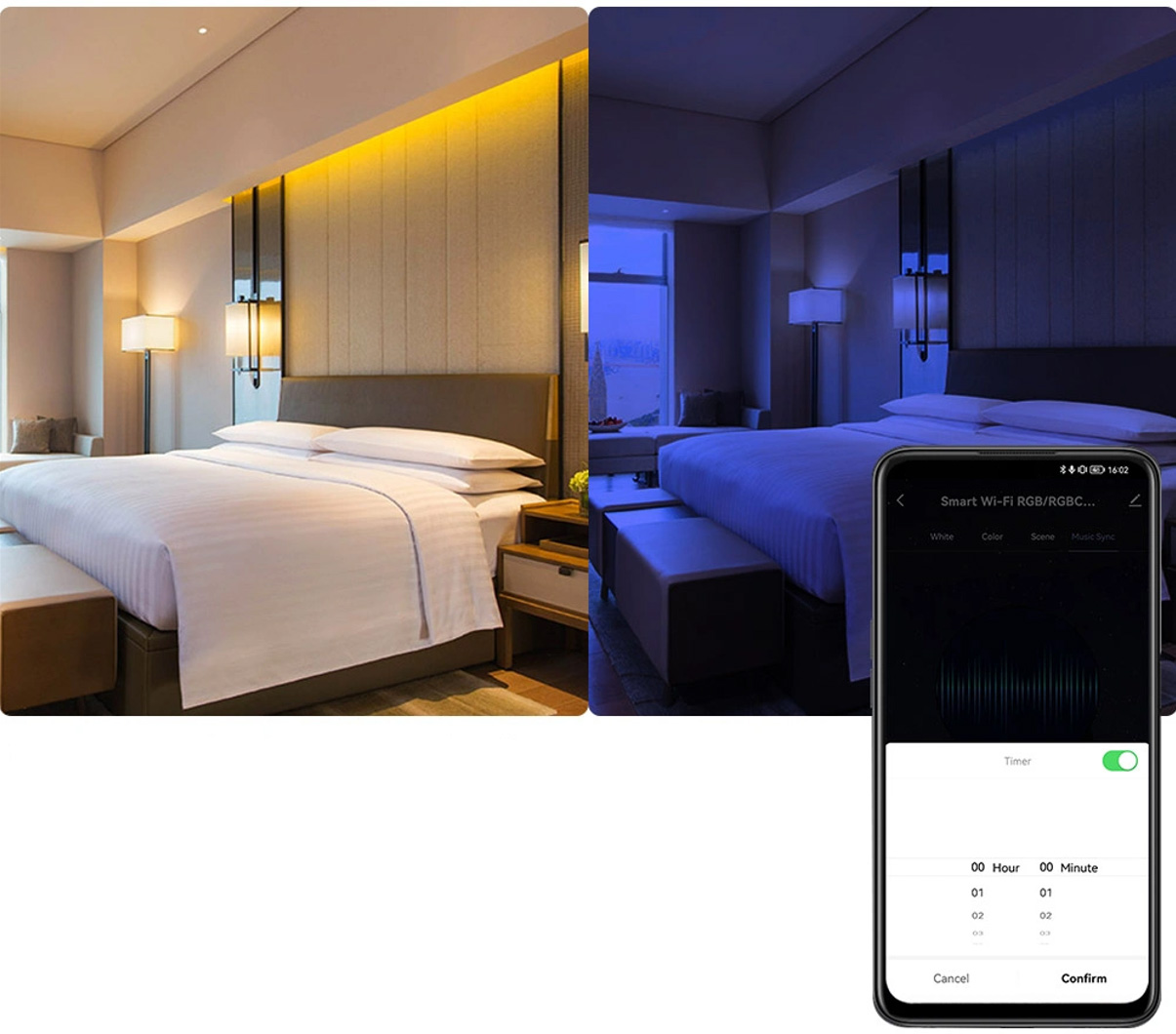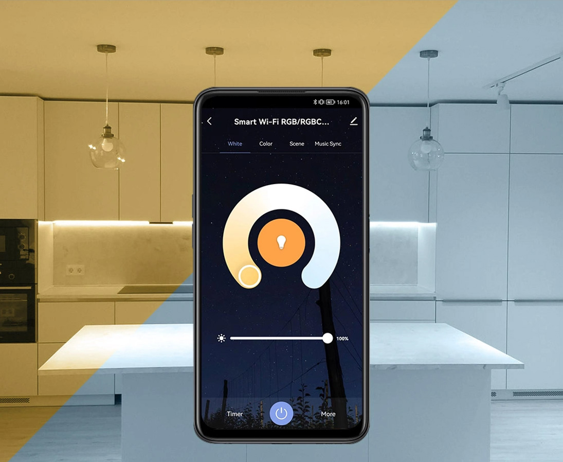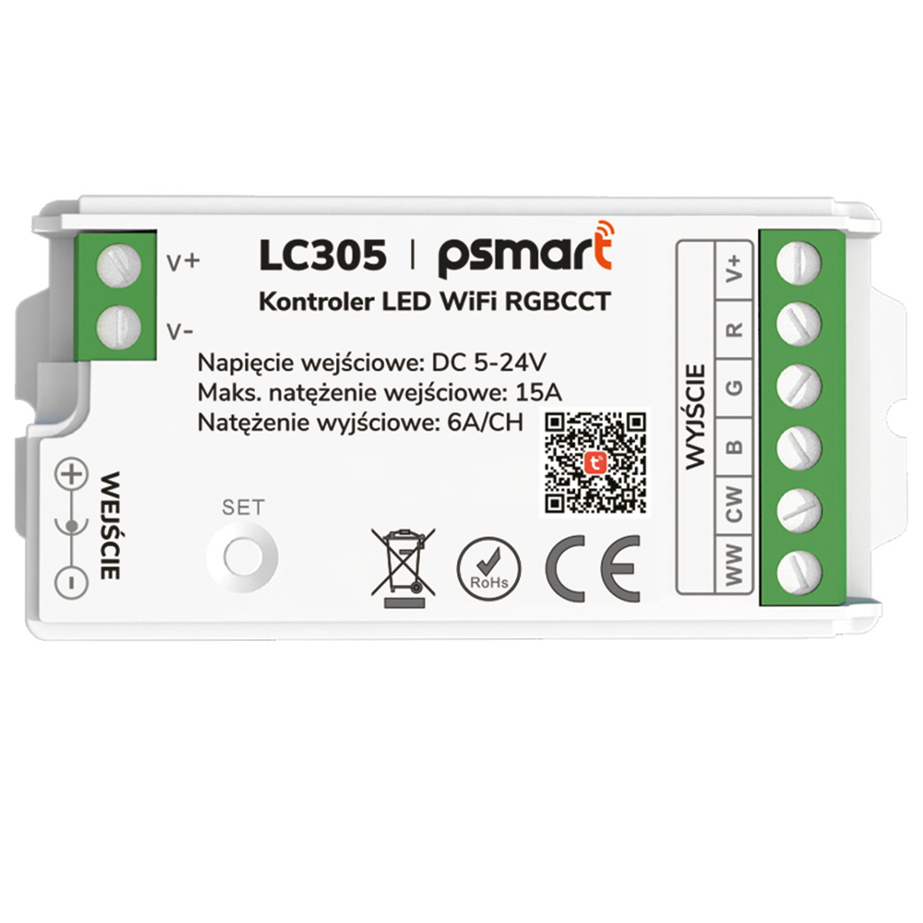 Kompakts 5-in-1 WiFi LED kontrolieris dažādu tipu LED lentēm: RGB, RGBW, RGBCCT, CCT un vienkrāsas (dimmēšana). Strādā 2.4GHz Wi‑Fi tīklā bez vārtejas un tiek vadīts ar TUYA/Smart Life lietotni, atbalsta automatizācijas, grafikus, ainas un balss vadību (Amazon Alexa, Google Assistant). Iebūvēts mikrofons mūzikas režīmam (gaismas efekti sinhronizējas ar ritmu). Barošana 5–24V DC, kopējā izejas strāva līdz 15A (līdz 6A uz kanālu). Izmērs 70×40×20 mm. Komplektā: kontrolieris, divpusējā līmlente, lietotāja rokasgrāmata. Produkta kods: LC305.