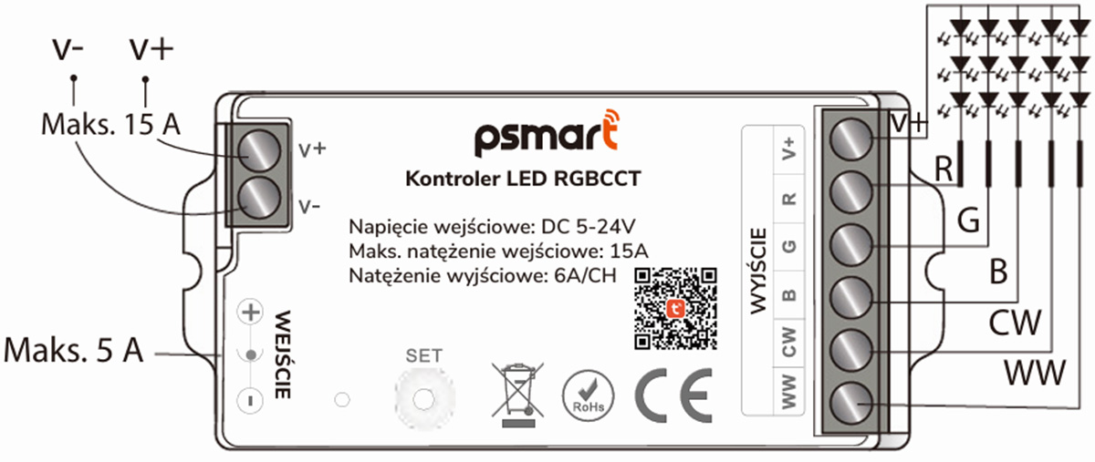 PSMART Mini WiFi LED kontrolieris RGBCCT 5-24V 15A (TUYA/Smart Life, PX sērija)