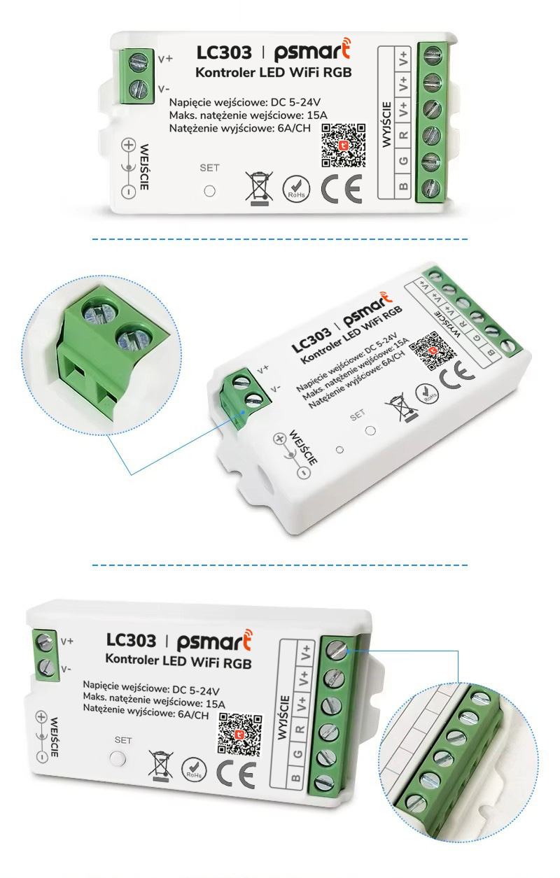 PSMART Mini RGB LED kontrolieris paredzēts 5–24V līdzstrāvas RGB LED lentēm (V+, R, G, B) ar kopējo izejas strāvu līdz 15A (līdz 6A katrā kanālā). Savienojas tieši ar mājas WiFi maršrutētāju (2,4GHz) bez papildu vārtejas un tiek vadīts ar TUYA platformu (Smart Life / Tuya Smart), nodrošinot tālvadību, grafikus, ainas, 0–100% aptumšošanu un balss vadību (Google Home / Amazon Alexa). Iebūvēts mikrofons ļauj izmantot mūzikas režīmu, kur apgaismojums reaģē uz skaņu. Kompaktais korpuss (70×40×20 mm) piemērots slēptai uzstādīšanai. Saderīgs ar PX sērijas RF tālvadības pultīm (ja tiek izmantotas atbilstošas pultis). Produkta kods: LC303.