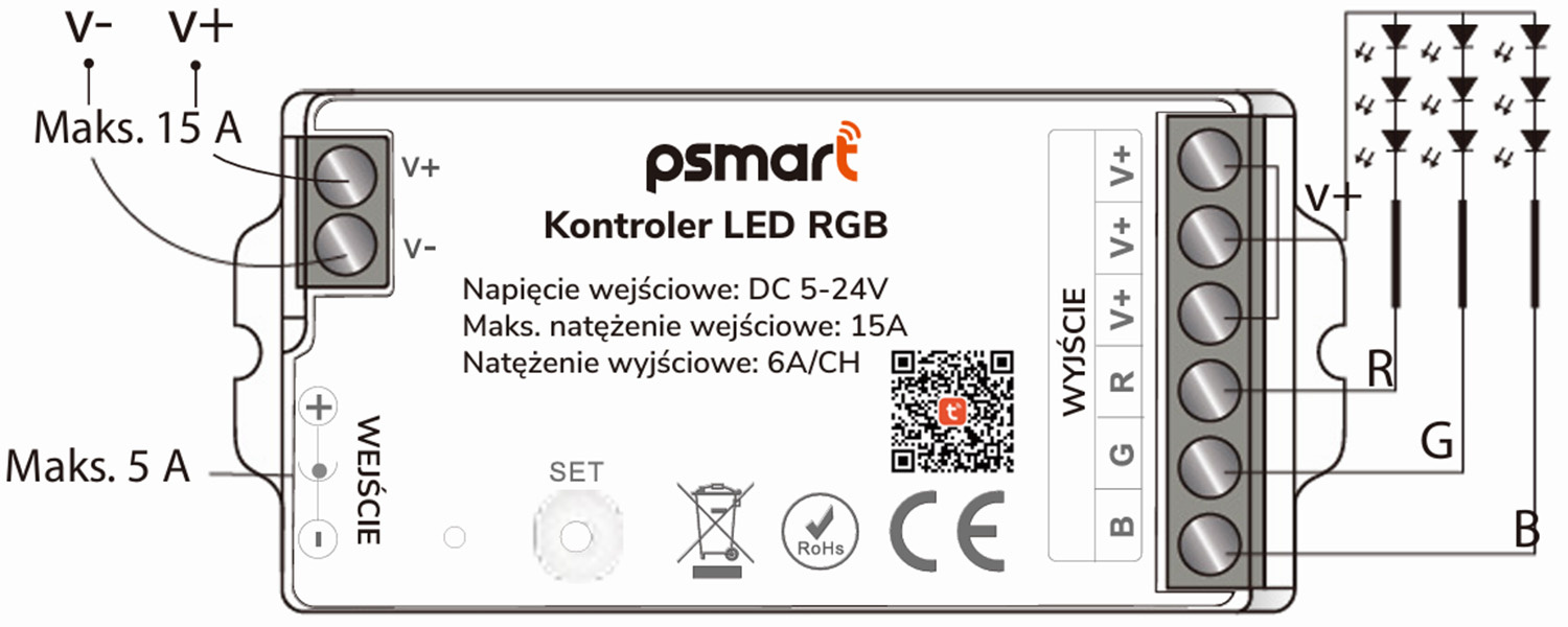PSMART Mini WiFi RGB LED kontrolieris TUYA 5–24V 15A (PX sērija)
