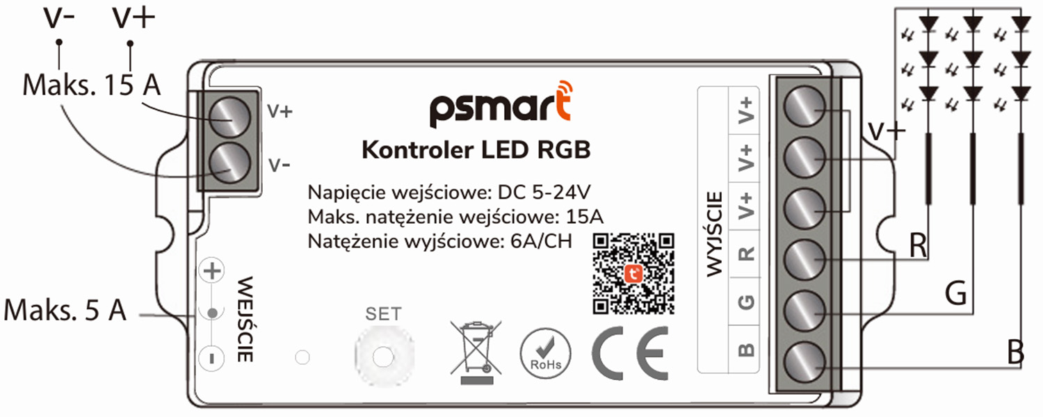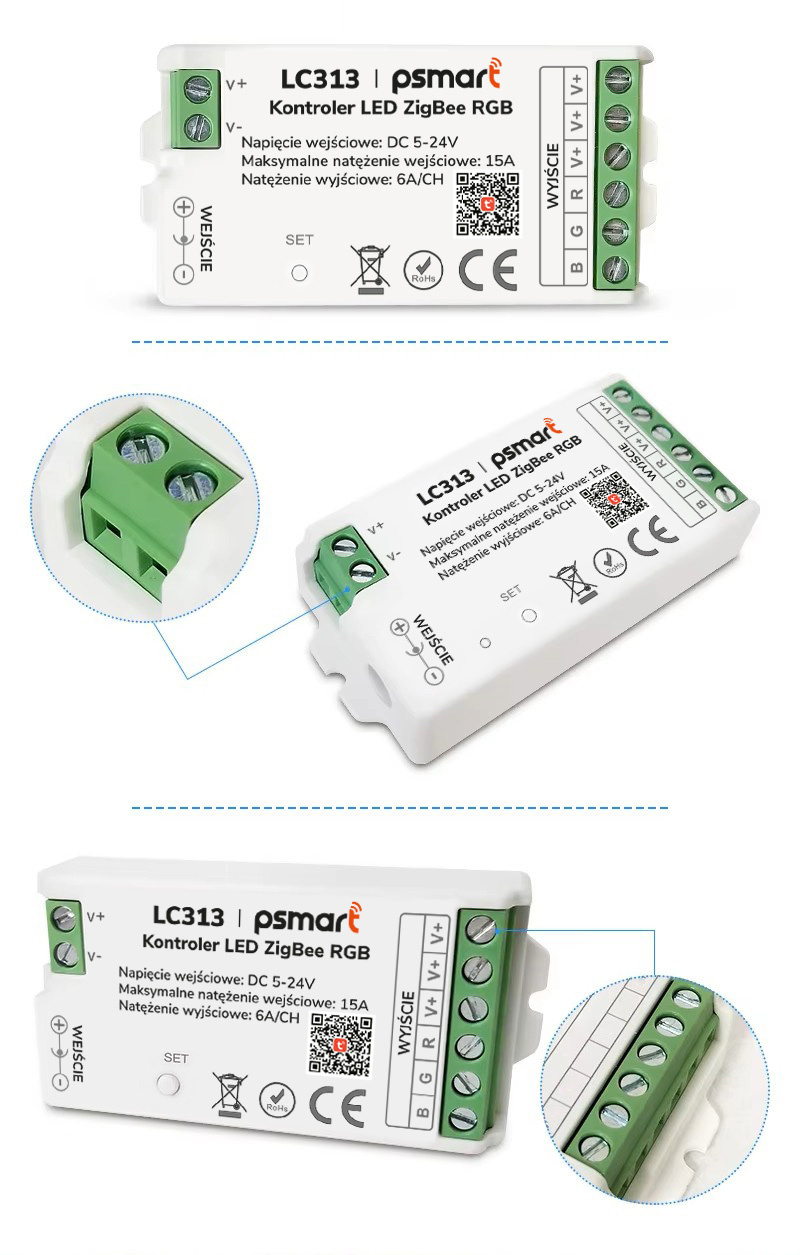 Elektriskie parametri: 5–24V DC, maksimālā izejas strāva 15A kopā (līdz 6A katrā kanālā). Korpuss no ugunsdroša polikarbonāta, kompakts izmērs 70×40×20 mm. Komplektā: kontrolieris, instrukcija, 3M montāžas paliktnis. Produkta kods: LC313.