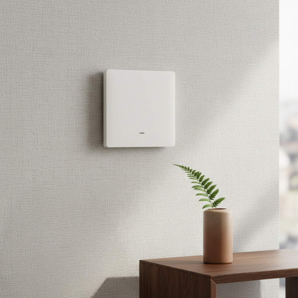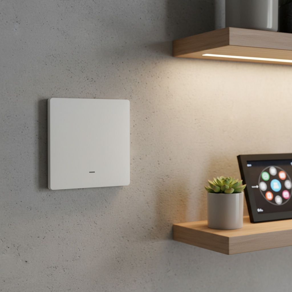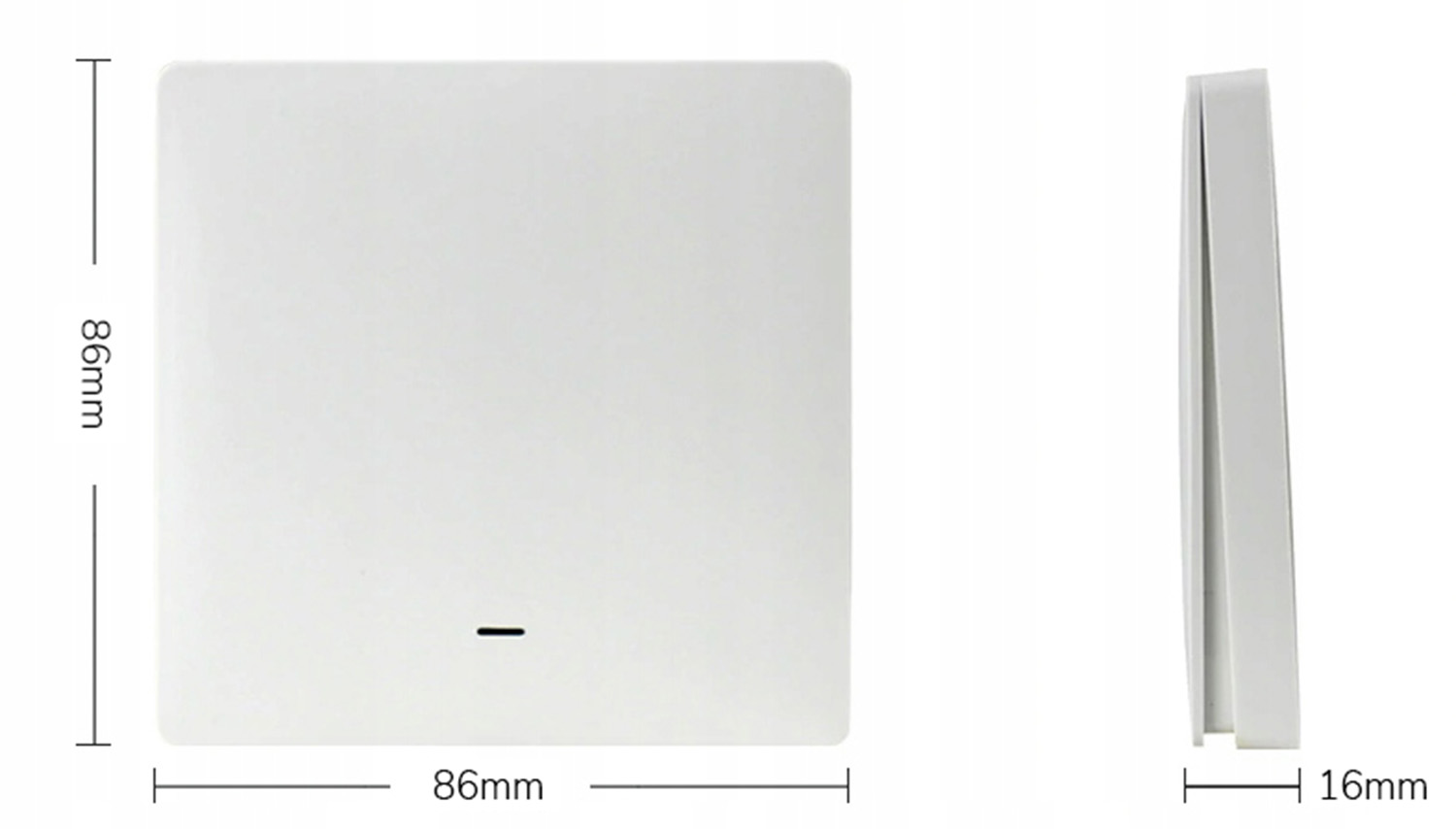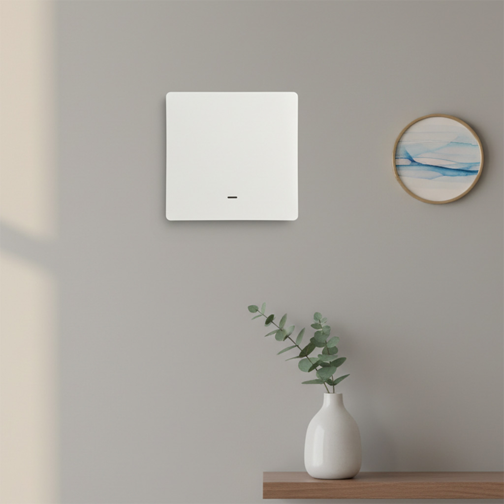 PSMART PX sērijas bezvadu sienas slēdzis (tālvadības pults) 1 zonas apgaismojuma vadībai. Paredzēts darbam tikai ar PSMART PX sērijas uztvērējiem/kontrolieriem, izmantojot RF 2.4GHz sakarus ar darbības rādiusu līdz 30 m. Virsmas montāža bez elektroinstalācijas — var pielīmēt vai pieskrūvēt. Fiziskas pogas ieslēgšanai/izslēgšanai, indikatora lampiņa signāla nosūtīšanas apstiprināšanai. Barošana: CR2032 baterija. Izmēri: 86×86×16 mm. Komplektā: slēdzis, CR2032 baterija, divpusējā līmlente, lietotāja rokasgrāmata.