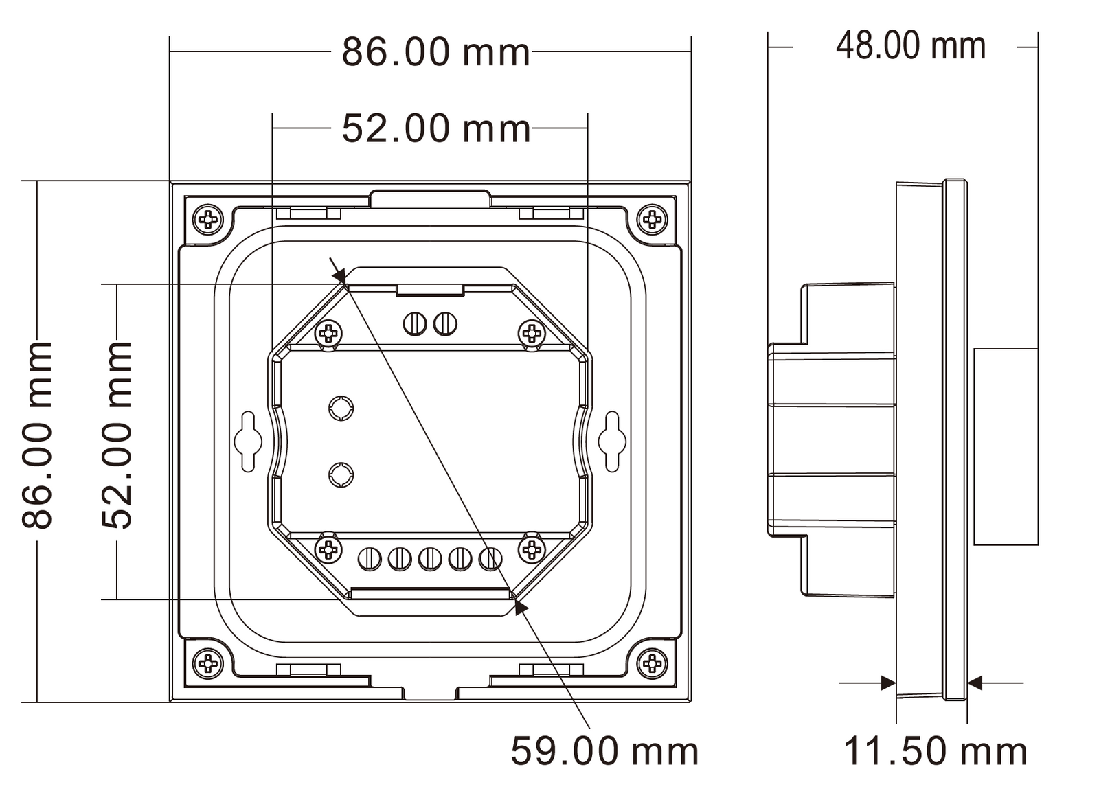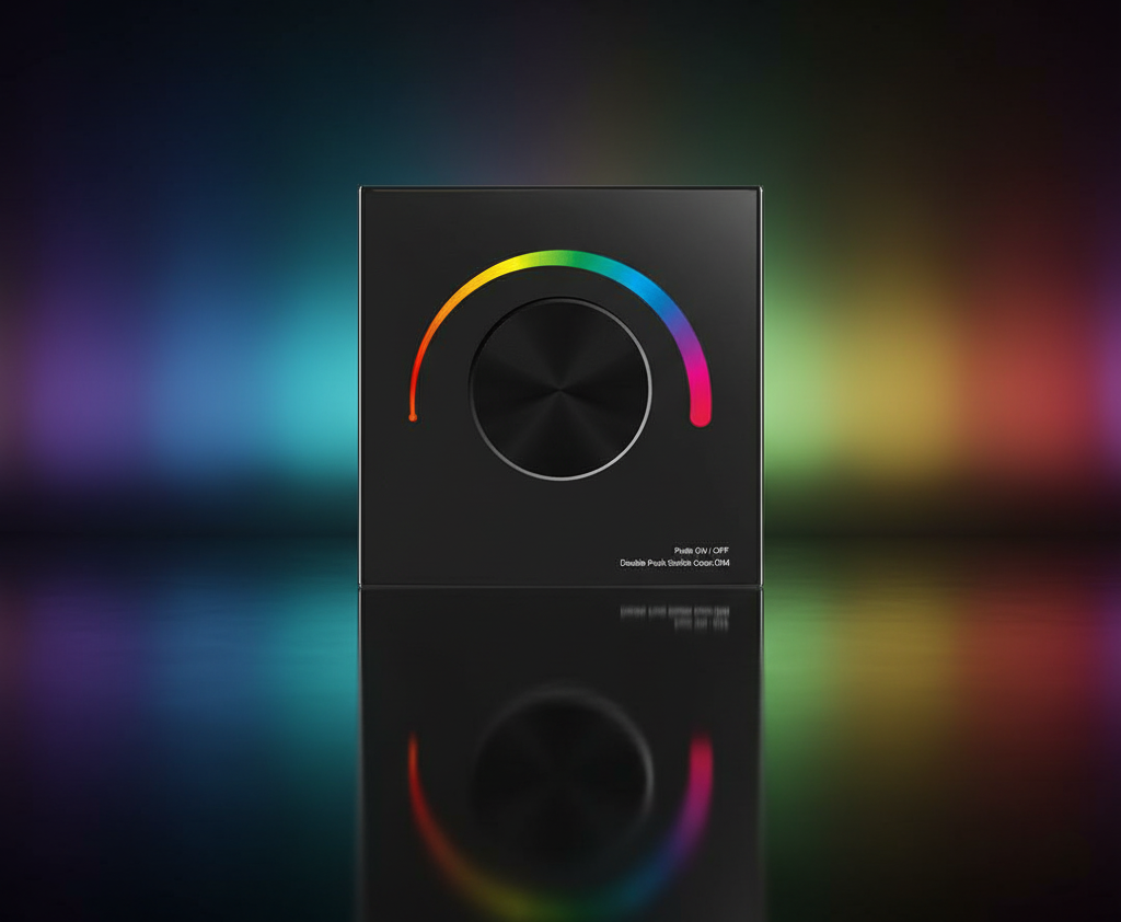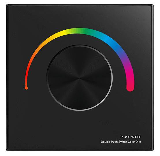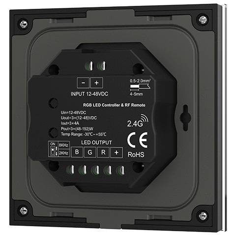 SD sērijas RGB DIM kontrolieris trīskrāsu (RGB) LED lentēm ar 2,4 GHz RF vadību. Paredzēts montāžai standarta Eiropas instalācijas kārbā (86 mm) ar stikla paneļa dizainu melnā krāsā.