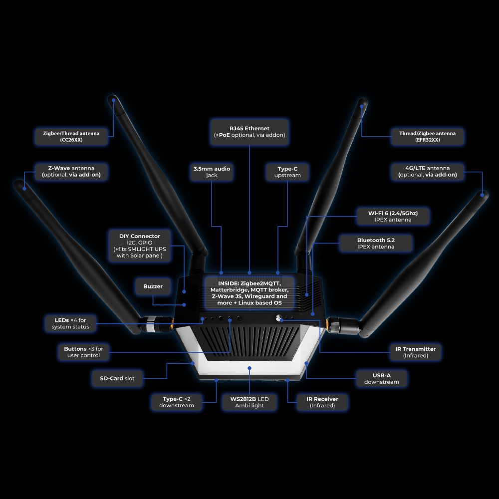 Profesionāls Linux bāzes viedās mājas centrmezgls ar integrētu Zigbee un Thread radio (CC2674P10 + EFR32MG24), Wi‑Fi/Bluetooth, Ethernet un Matter tilta iespējām. Paredzēts lokālai automatizācijai ar Zigbee2MQTT, Node‑RED, Mosquitto MQTT un Matterbridge; paplašināms ar Z‑Wave, 4G/LTE un PoE moduļiem.