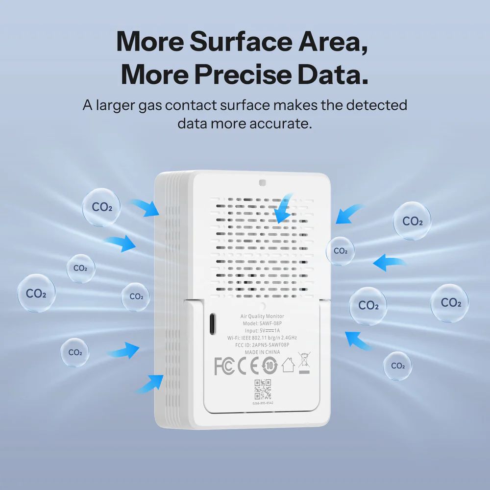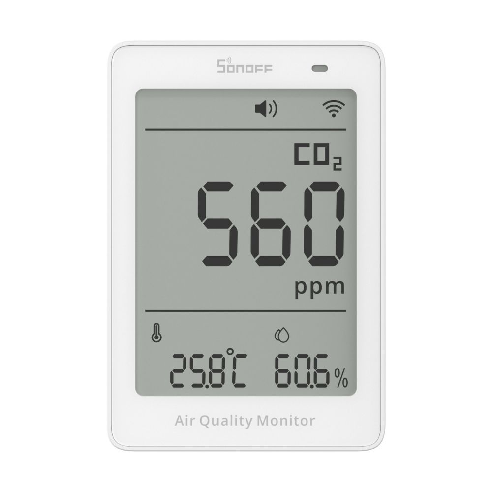 SONOFF AirGuard CO₂ (SAWF-08P) ir gaisa kvalitātes monitors ar NDIR CO₂ sensoru, kas ik pēc 5 sekundēm atjaunina mērījumus un reāllaikā attēlo CO₂ līmeni, temperatūru un mitrumu. Ierīce brīdina par paaugstinātu CO₂ ar skaņas un gaismas signāliem, kā arī push paziņojumiem lietotnē, un piedāvā ieteikumus gaisa kvalitātes uzlabošanai. Atbalsta vēsturisko datu uzkrāšanu un eksportu līdz 365 dienām ilgtermiņa analīzei. Pateicoties Matter atbalstam (Matter over Wi‑Fi 2.4 GHz), to var integrēt Apple Home, Google Home, Amazon Alexa un Samsung SmartThings ekosistēmās (nepieciešams Matter centrmezgls) un izmantot automatizācijās, piemēram, ventilācijas/HVAC vadībai pēc CO₂, temperatūras vai mitruma sliekšņiem.