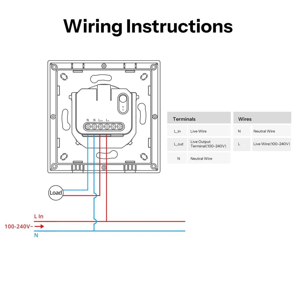 Tehniski: 1 kanāls (1 grupa), 100–240 V~ 50/60 Hz, max 10 A (rezistīvai slodzei), nepieciešams neitrālais vads, Wi‑Fi 2.4 GHz (802.11 b/g/n), CE/RoHS.