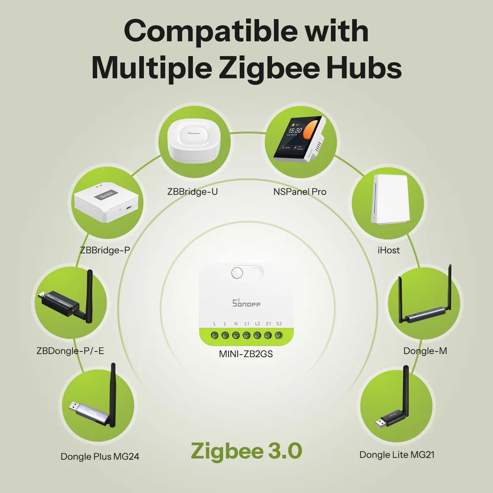 SONOFF MINI-ZB2GS (MINI DUO) ir īpaši kompakts, divkanālu Zigbee 3.0 viedā slēdža modulis, kas uzlabo jūsu esošo sienas slēdzi ar viedām funkcijām, nemainot tā izskatu. Tas ir paredzēts ievietošanai standarta elektrības kārbās, var kontrolēt divas neatkarīgas apgaismojuma ķēdes un atbalsta līdz pat 16 A (maksimāli 10 A uz kanālu, rezistīvā slodze). Ietver taimera funkcijas, ainas un grupu vadību.