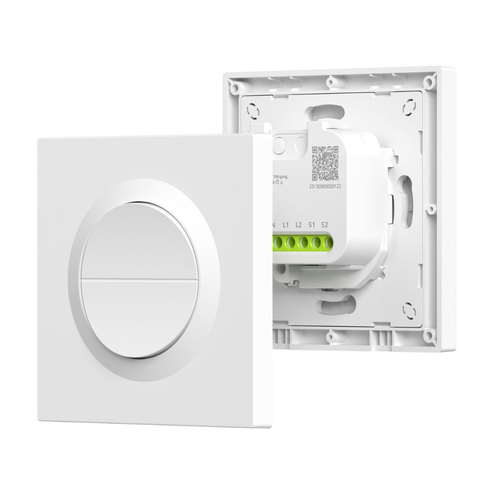 Kompakts 2-kanālu Zigbee 3.0 sienā iebūvējams slēdža modulis ar fāzi+neitrāli, līdz 10A/kanālā (16A kopā). Atbalsta ārējos sienas slēdžus, grafikus, ainas un darbojas ar Home Assistant (ZHA/Zigbee2MQTT), Alexa/Google Home/SmartThings caur Zigbee centrmezglu.