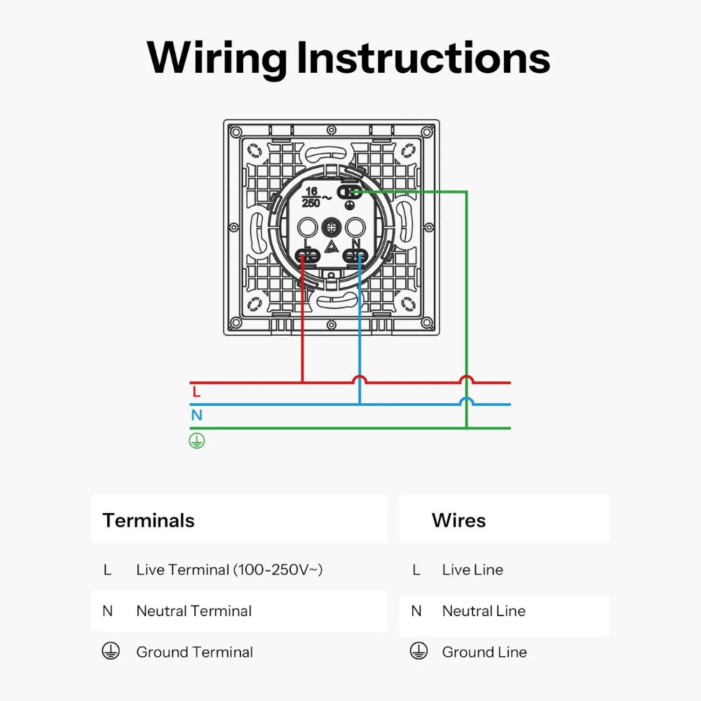 Elektriskie parametri: 100–250V AC, 50/60Hz, maks. 16A (rezistīvā slodze), maks. 4000W. Saderīga ar F tipa (Schuko) kontaktdakšām. Ieteicamais vads: 1,5–2,5 mm² vara vadītājs (SOL/STR).