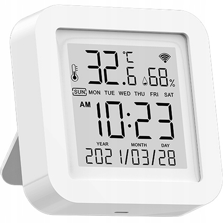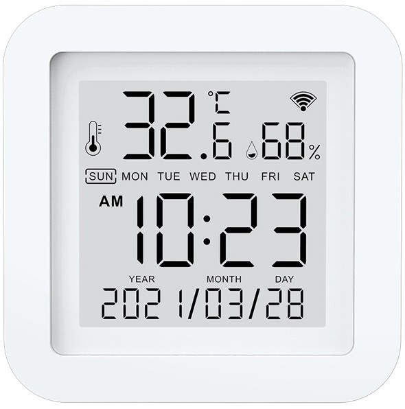 Mūsdienīgs WiFi temperatūras un mitruma sensors ar skaidru LCD displeju, kas pastāvīgi rāda gaisa temperatūru, relatīvo mitrumu, kā arī automātiski sinhronizētu laiku un datumu. Ierīce pieslēdzas tieši 2.4GHz Wi‑Fi tīklam un nosūta rādījumus uz viedtālruni, kur pieejama mērījumu vēsture, min/max analīze un paziņojumi.