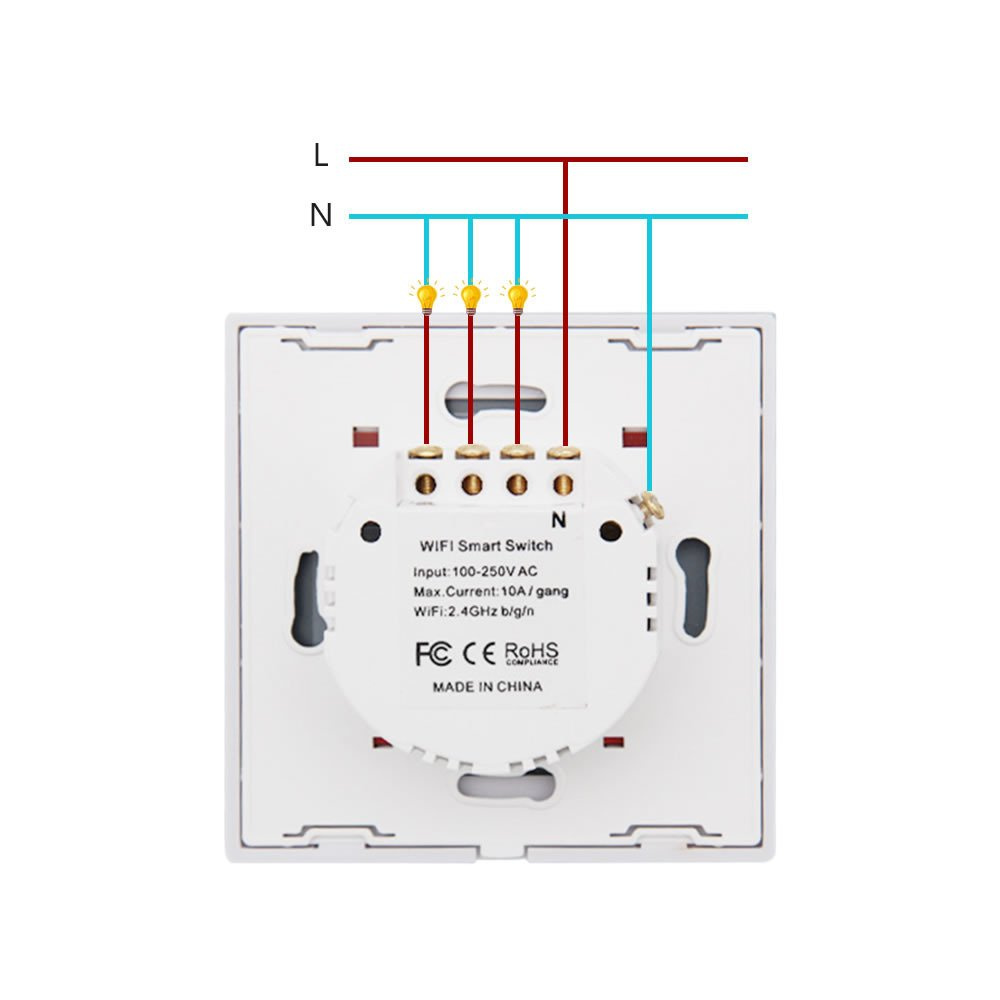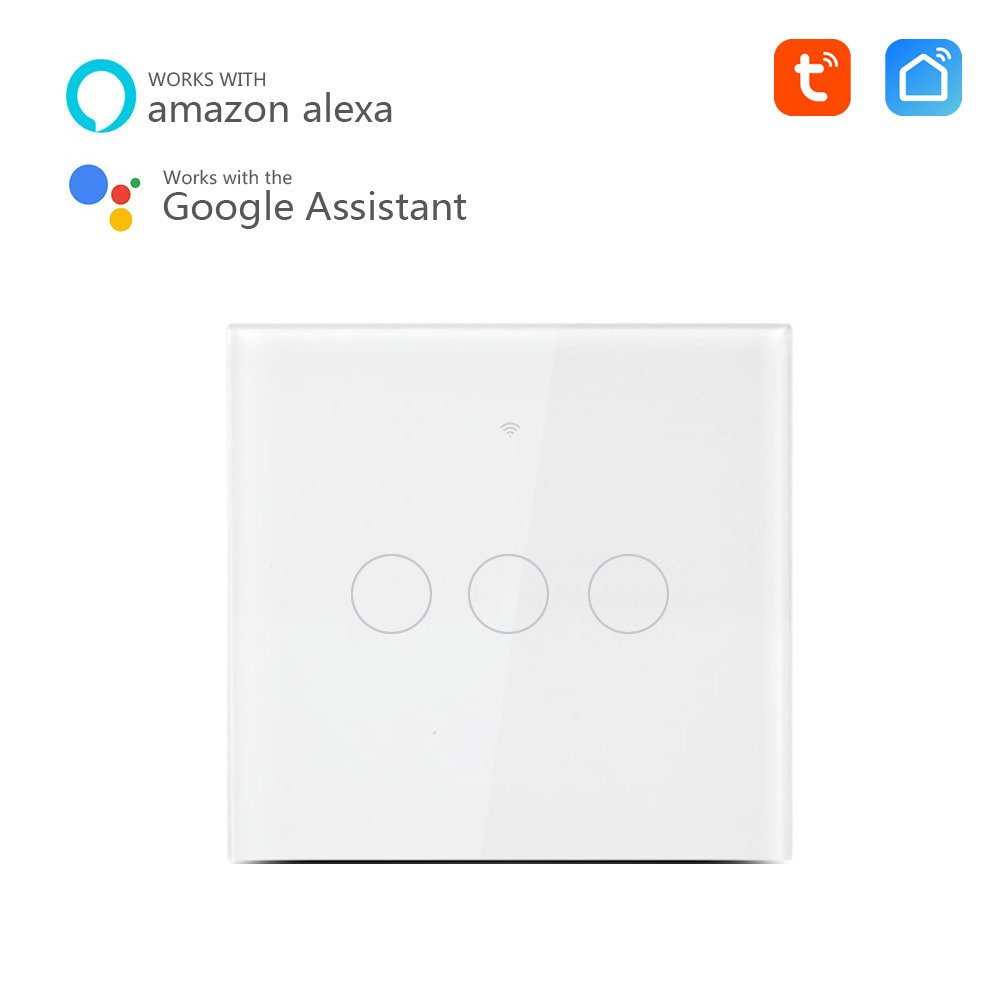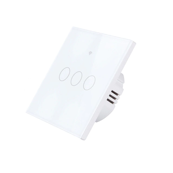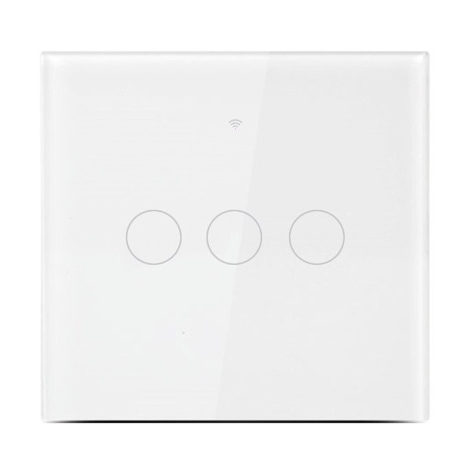 TUYA 3C ir 3 kanālu viedais skārien sienas slēdzis, kas ļauj attālināti ieslēgt/izslēgt trīs apgaismojuma barošanas ķēdes, izmantojot lietotni vai skārienpaneli.