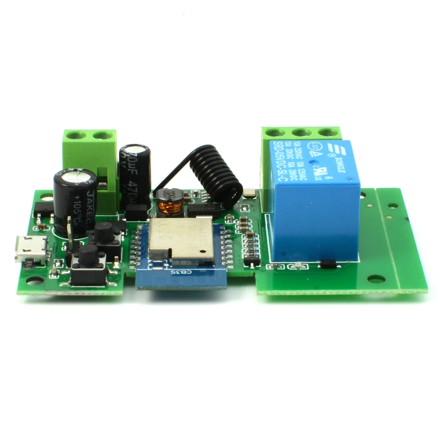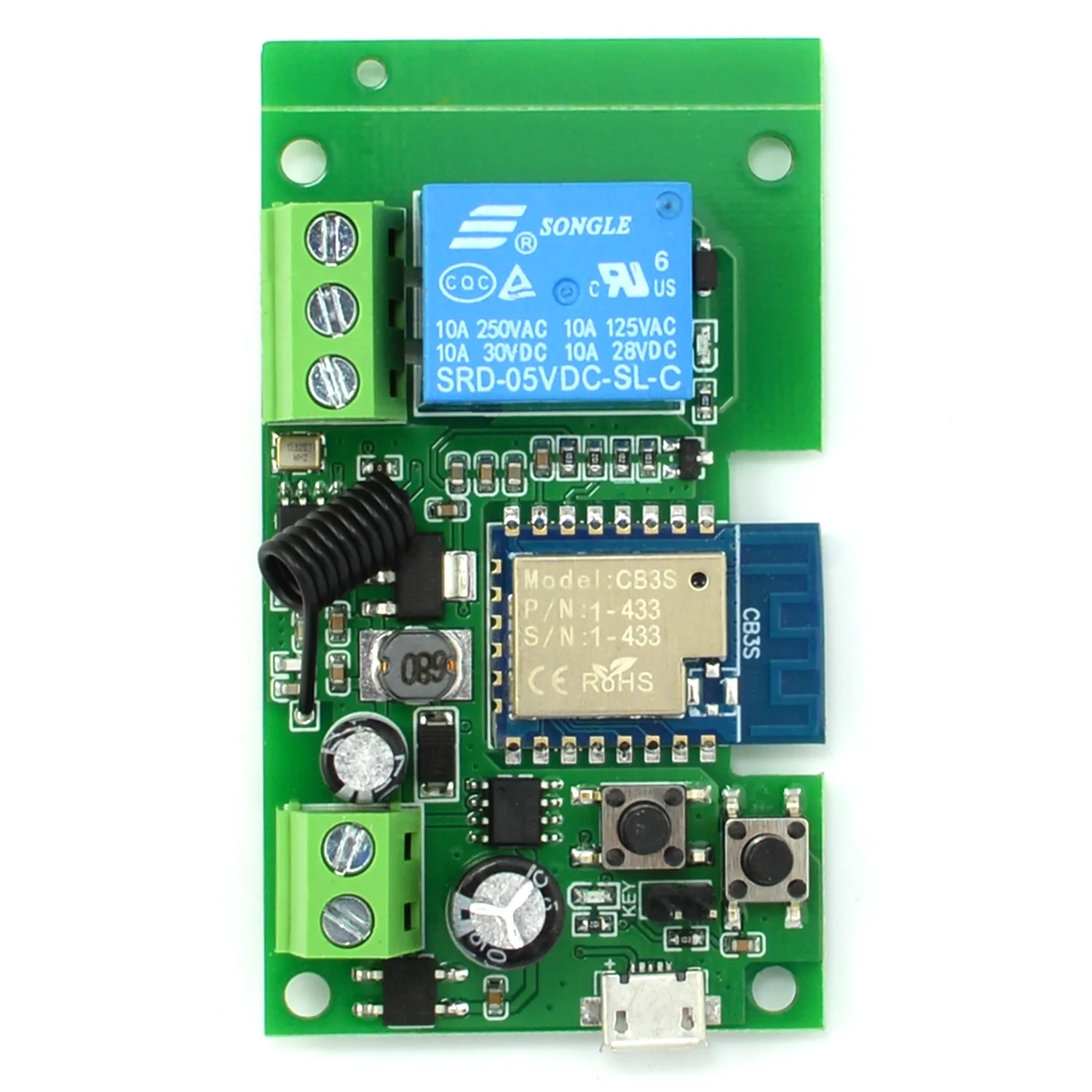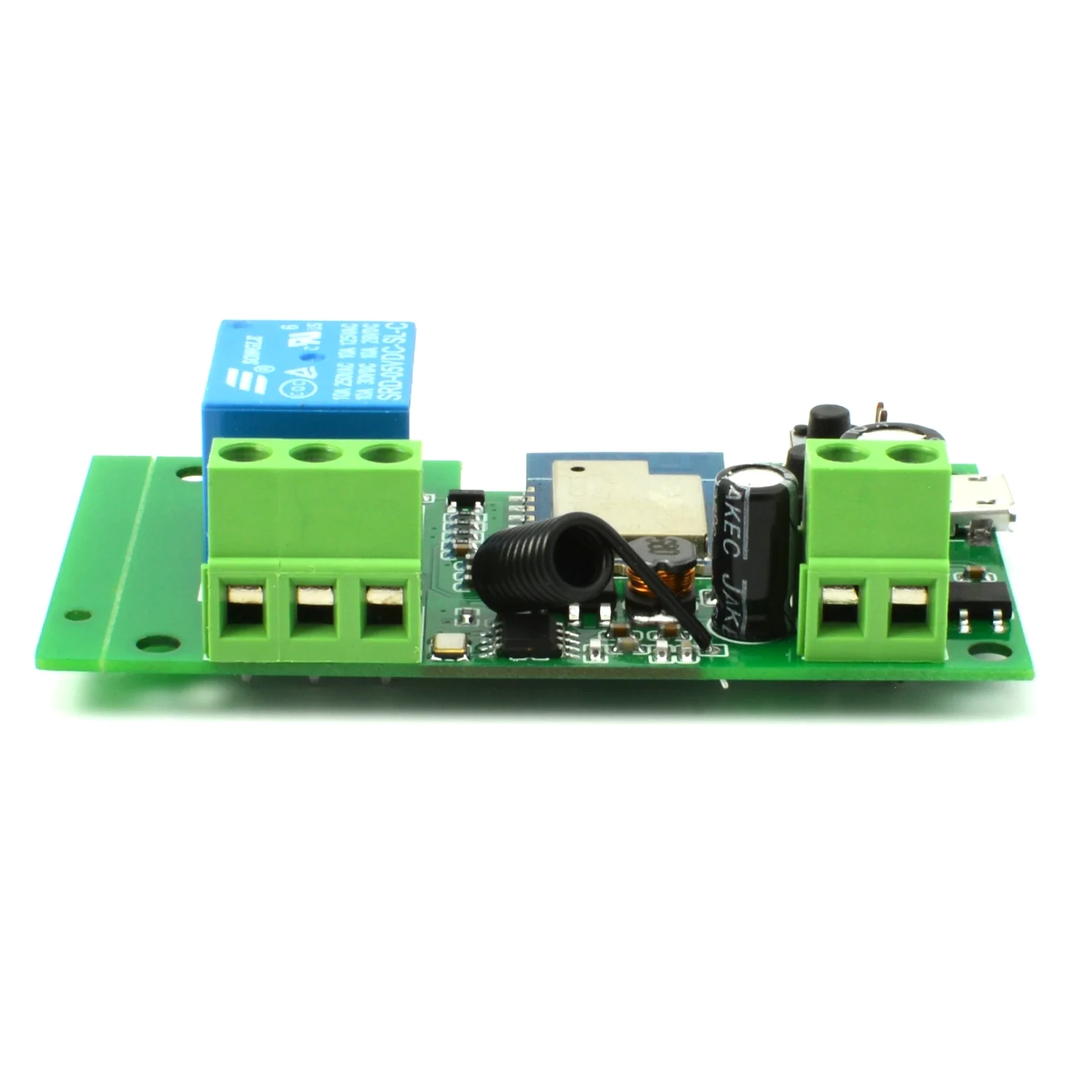 TUYA 1 kanāla bezsprieguma releja modulis ar Wi‑Fi 2.4GHz un RF 433.92MHz (EV1527/EV1525 fiksētais kods) atbalstu. Barošana: 5V Micro‑USB vai 7–32V AC/DC. Režīmi: monostabils, bistabils, taimeris. Savietojams ar Tuya Smart, Google Home un Amazon Alexa.