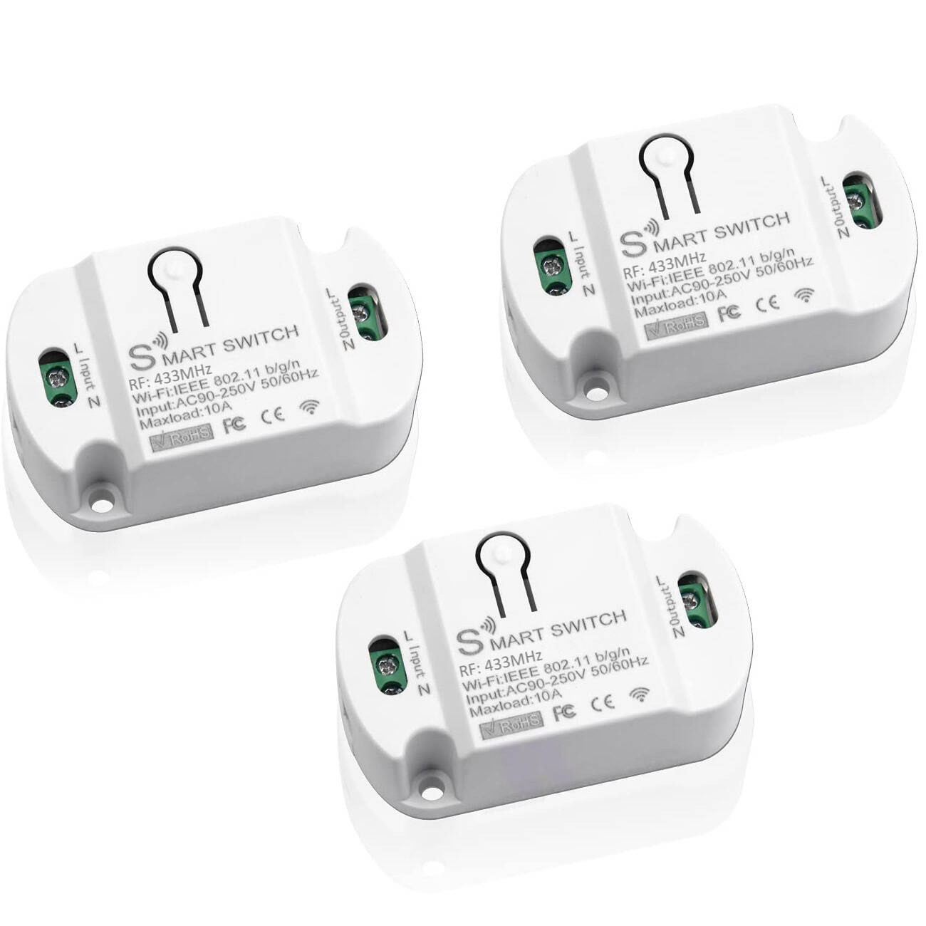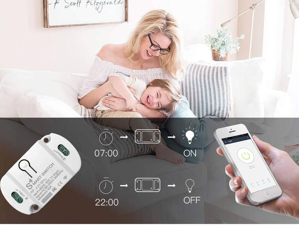 Viedais 230V relejs ar Wi‑Fi (TUYA/Smart Life) un 433 MHz RF vadību. Atbalsta taimerus, grafikus, balss vadību (Google Home/Alexa) un 3 darbības režīmus līdz 10A (2200W).