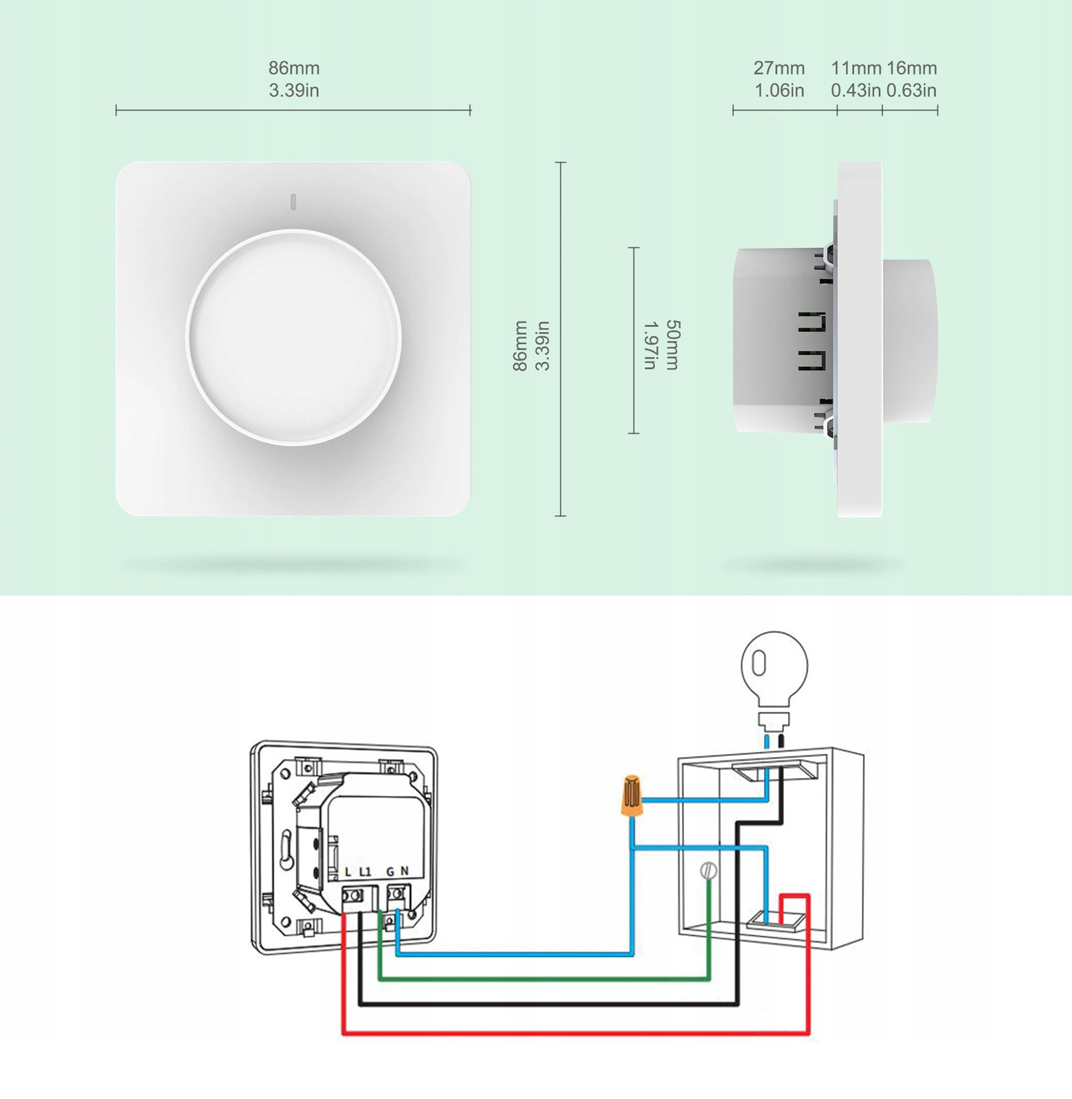 TUYA ZigBee 3.0 sienas dimmeris (KT sērija) vienas apgaismojuma ķēdes spilgtuma regulēšanai ar vienmērīgu aptumšošanu/paspilgtināšanu. Atbalsta lokālu vadību ar pogu/rotācijas potenciometru un attālinātu vadību caur TUYA Smart Life lietotni (iOS/Android), ieskaitot grafikus, ainas, grupu kontroli un ierīces kopīgošanu.