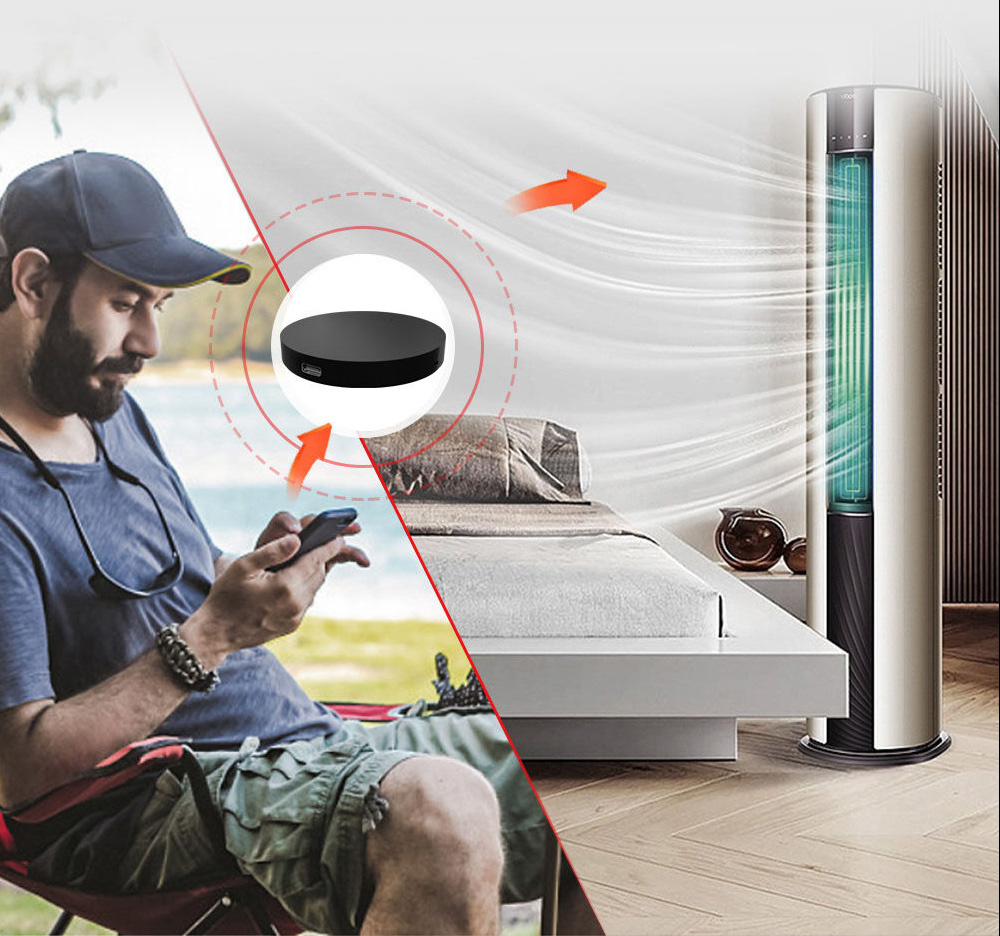 Universāls TUYA IR kontrolieris ar Wi‑Fi (2,4 GHz), kas ļauj vadīt infrasarkanās ierīces no iOS/Android lietotnes, ar taimeriem un balss vadību caur Alexa/Google Home.