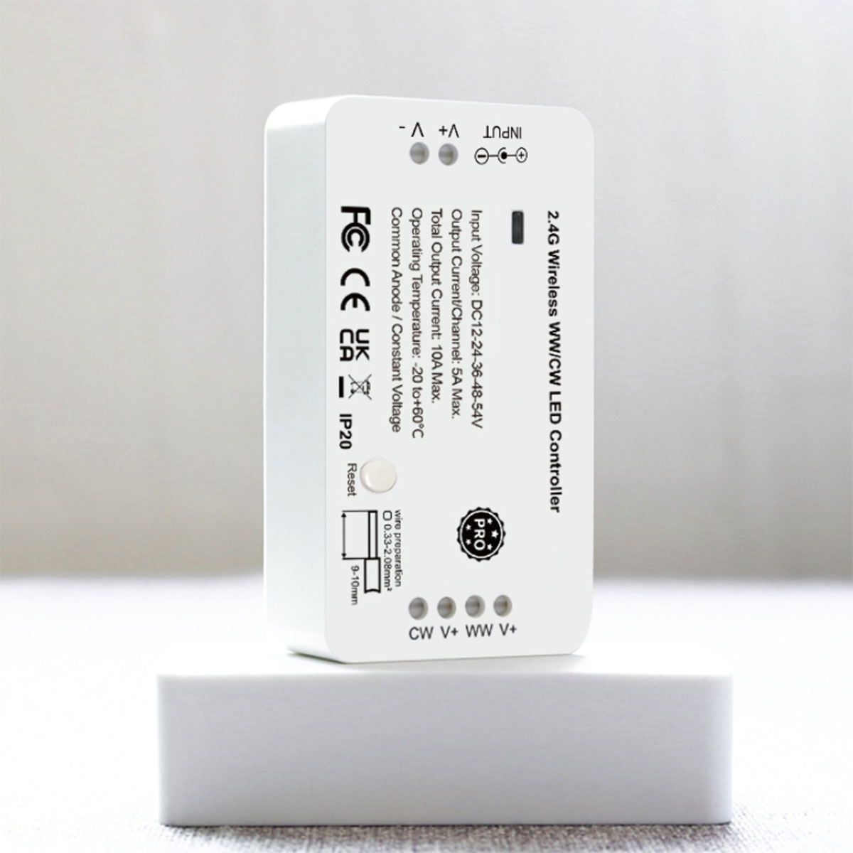 Viedais ZigBee + RF CCT LED kontrolieris CW/WW (CCT) LED lentēm. Ļauj regulēt spilgtumu un krāsu temperatūru (silta–auksta gaisma), veidot grafikus un automatizācijas, kā arī vadīt apgaismojumu attālināti.