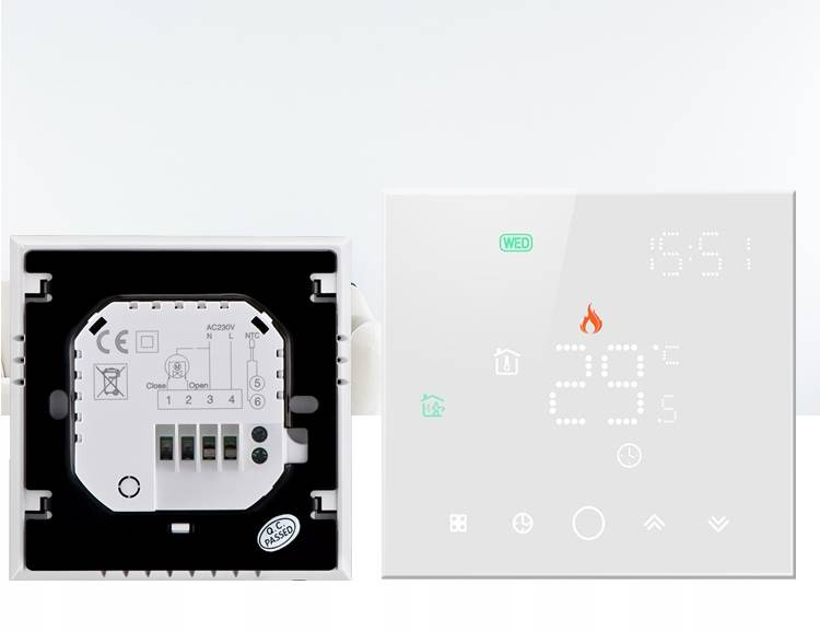 - Sensori: iebūvēts temperatūras sensors + ārējais grīdas sensors NTC3950 10k (komplektā, 2.5 m)